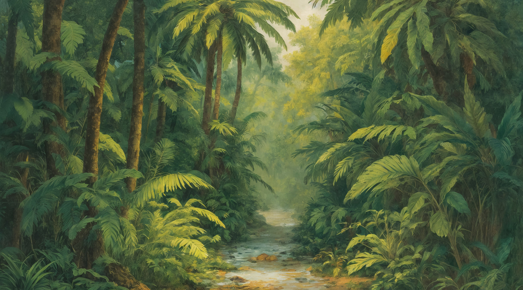The image shows an artistic impression of a serene stream and jungle scene.