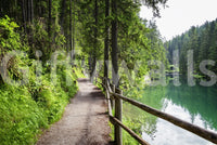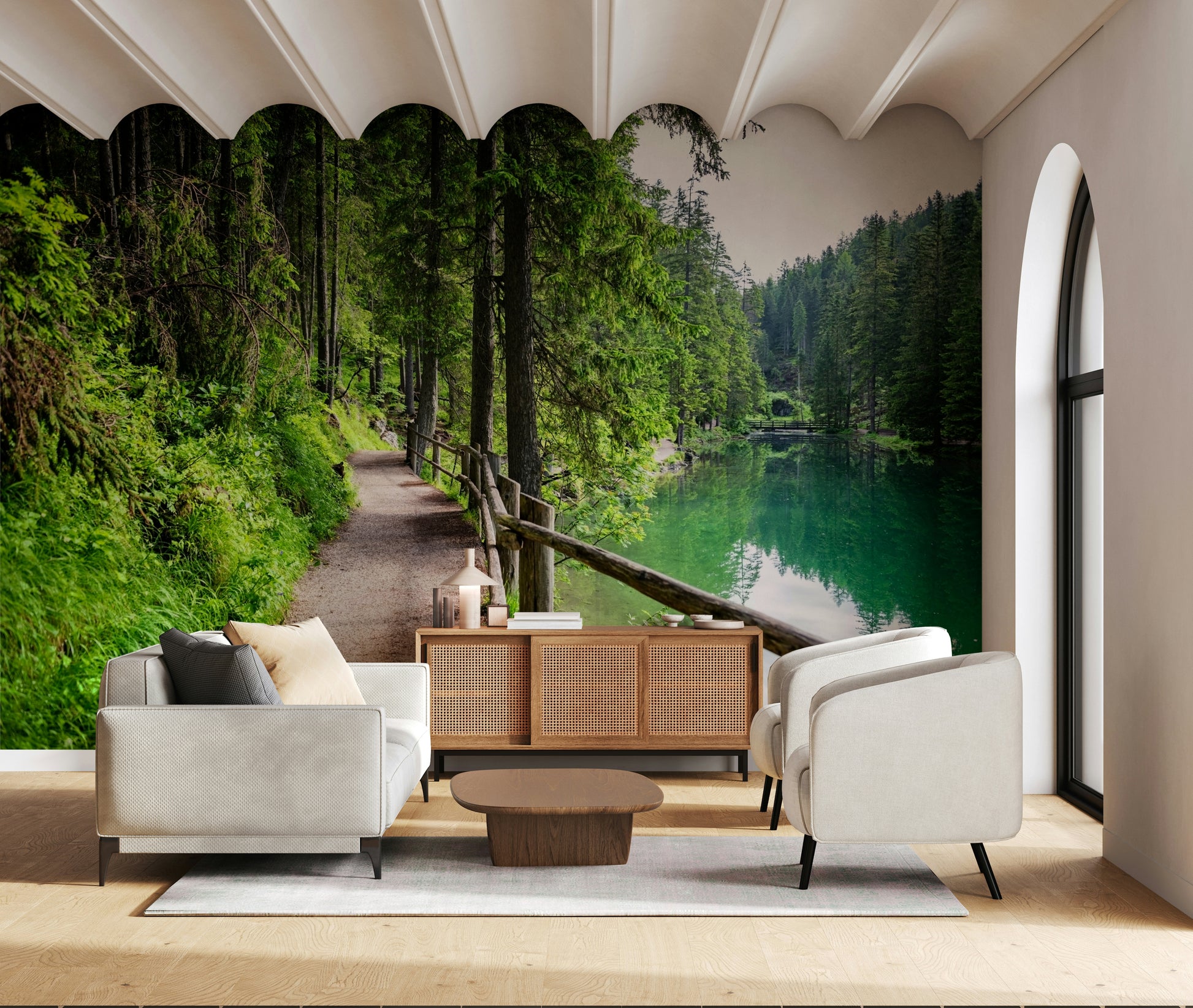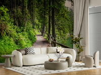 Transform your space with this tranquil forest scene. This wallpaper for walls showcases a pathway winding alongside a serene, emerald-green lake. Tall, lush trees create a canopy of green, reflecting in the clear water. The natural wood railing adds a touch of rustic charm. The vibrant greens and earthy browns bring a sense of calm to any room. Ideal for a living room, bedroom, or hallway, this design offers a refreshing escape. Its natural aesthetic complements both modern and traditional décor, enhancing the feeling of peace and tranquility.