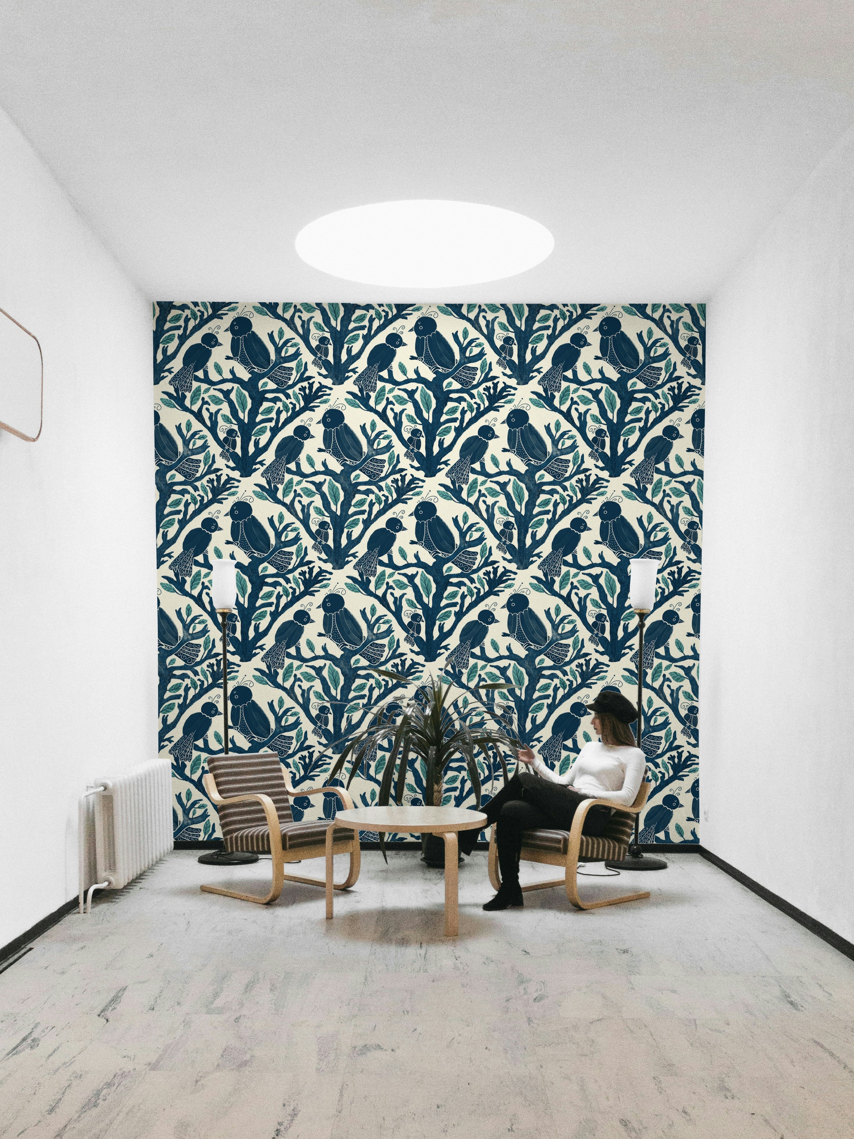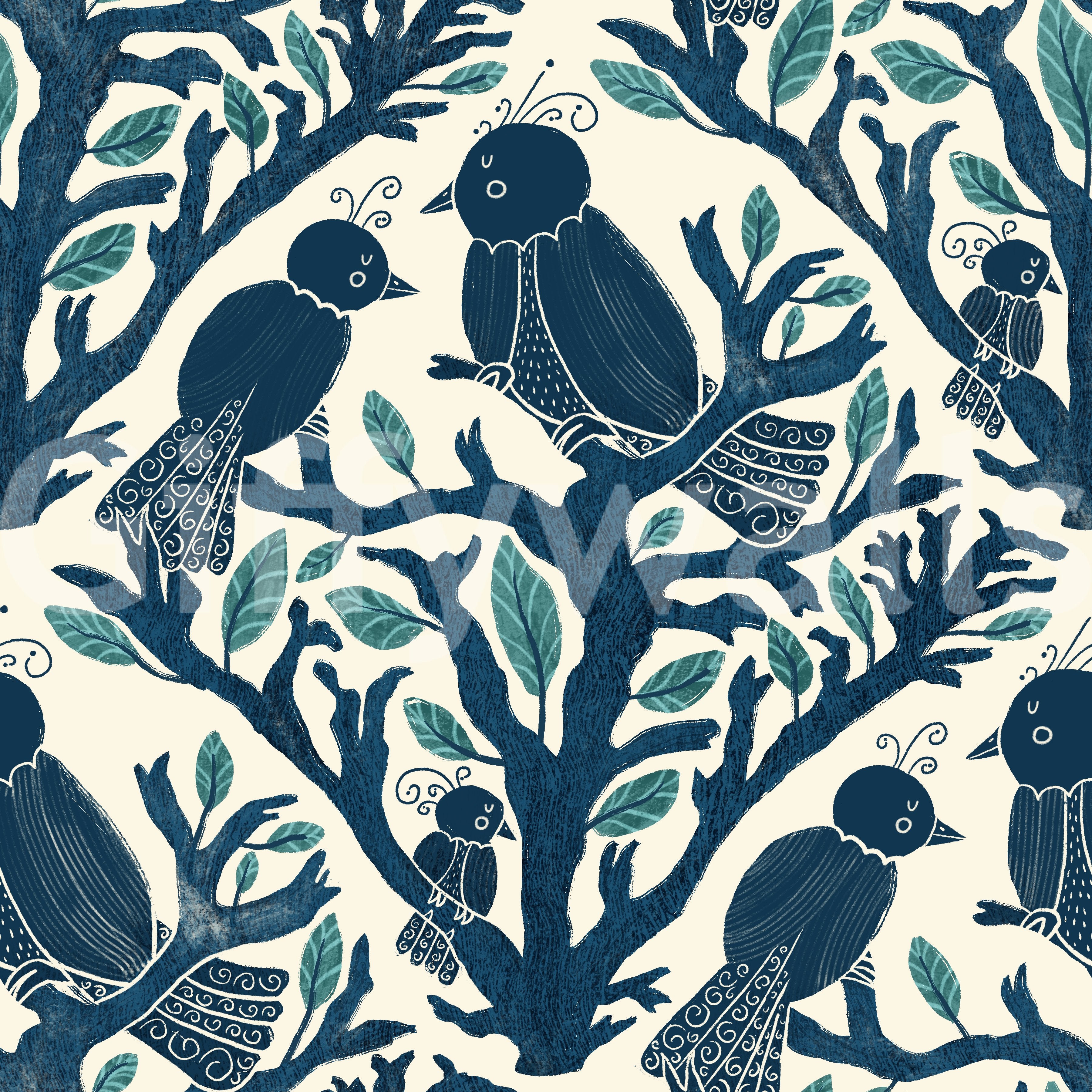 This whimsical wallpaper transports you to an enchanted forest, where stylized birds perch on intricately detailed branches. The color palette of deep blues and soft greens creates a calming and serene atmosphere. The hand-drawn style adds a touch of folk art charm, perfect for adding a touch of magic and tranquility to any room. The seamless pattern ensures a cohesive and visually pleasing design, ideal for creating a statement wall or wrapping an entire space in this soothing woodland scene.