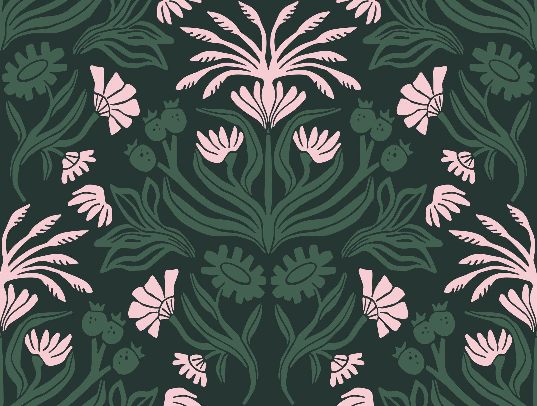 Step into a serene world with this enchanting floral wallpaper. The design features stylized pink blossoms gracefully intertwined with verdant foliage against a deep, forest green backdrop. The symmetrical arrangement creates a calming, harmonious visual, perfect for bedrooms or living areas. The botanical elements are bold yet delicate, offering a touch of nature-inspired beauty that's both modern and timeless. This wallpaper adds a touch of sophistication and tranquility to any space, creating a stylish sanctuary.