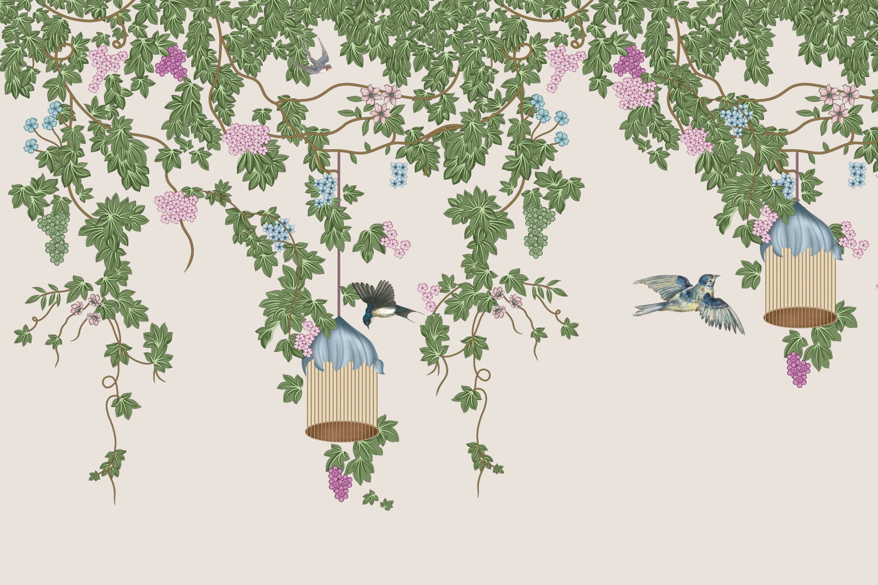 Bring a touch of whimsical charm to your home with this vintage-inspired wallpaper. Elegant green leaves intertwine with clusters of colorful blooms, framing stylized birdcages. A scattering of sweet songbirds completes the pastoral scene. This captivating wallpaper for walls enlivens bedrooms, hallways, or a cozy dining space. The soft palette and detailed design bring an element of sophisticated fun to interiors.