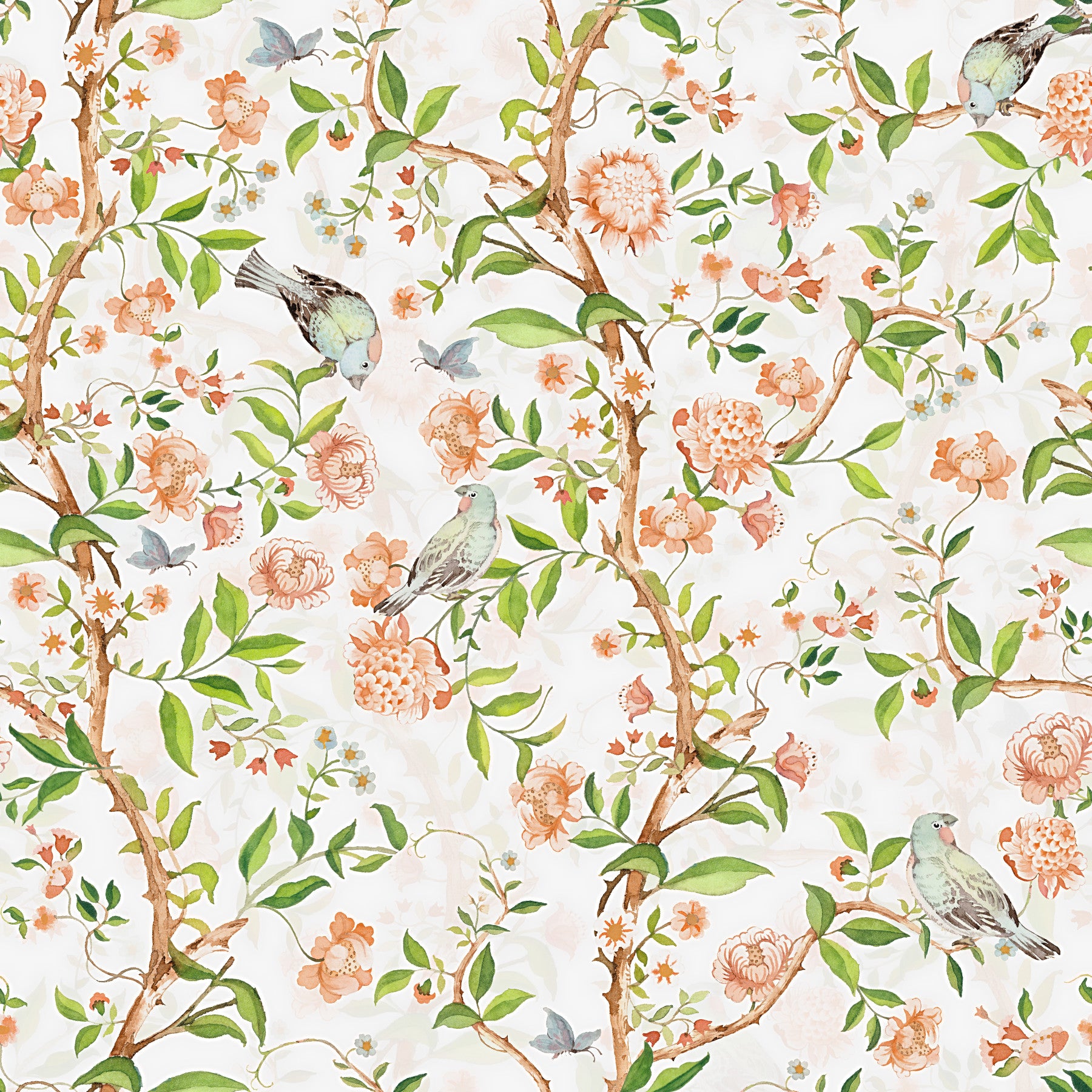 Escape to an enchanted world with this wallpaper's breathtaking depiction of a blossoming garden. Delicate watercolor brushstrokes bring to life a vibrant array of peach and pink flowers, interspersed with verdant leaves and charming birds. The overall effect is one of whimsical tranquility. Its intricate detailing and subtle pastel hues create a calming and sophisticated atmosphere, perfect for adding a touch of elegance and charm to a bedroom, living room, or nursery. The soft color palette and peaceful imagery will inspire a sense of calm and serenity.