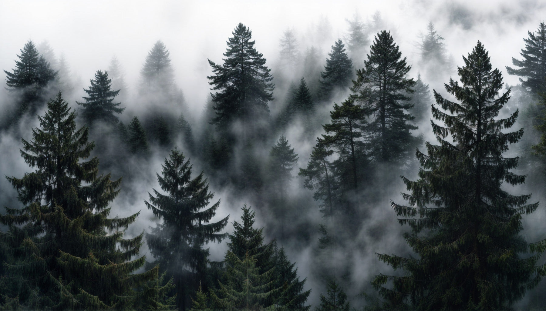 Transform your space with this evocative forest landscape. This wallpaper showcases dense evergreen trees enveloped in a mystical mist. The somber tones create a dramatic and serene effect. Use this wallpaper for walls to easily add depth and visual interest to your bedroom, living room, or office. The ethereal scene works well with rustic, modern, and minimalist designs, bringing a touch of woodland charm and natural beauty indoors.