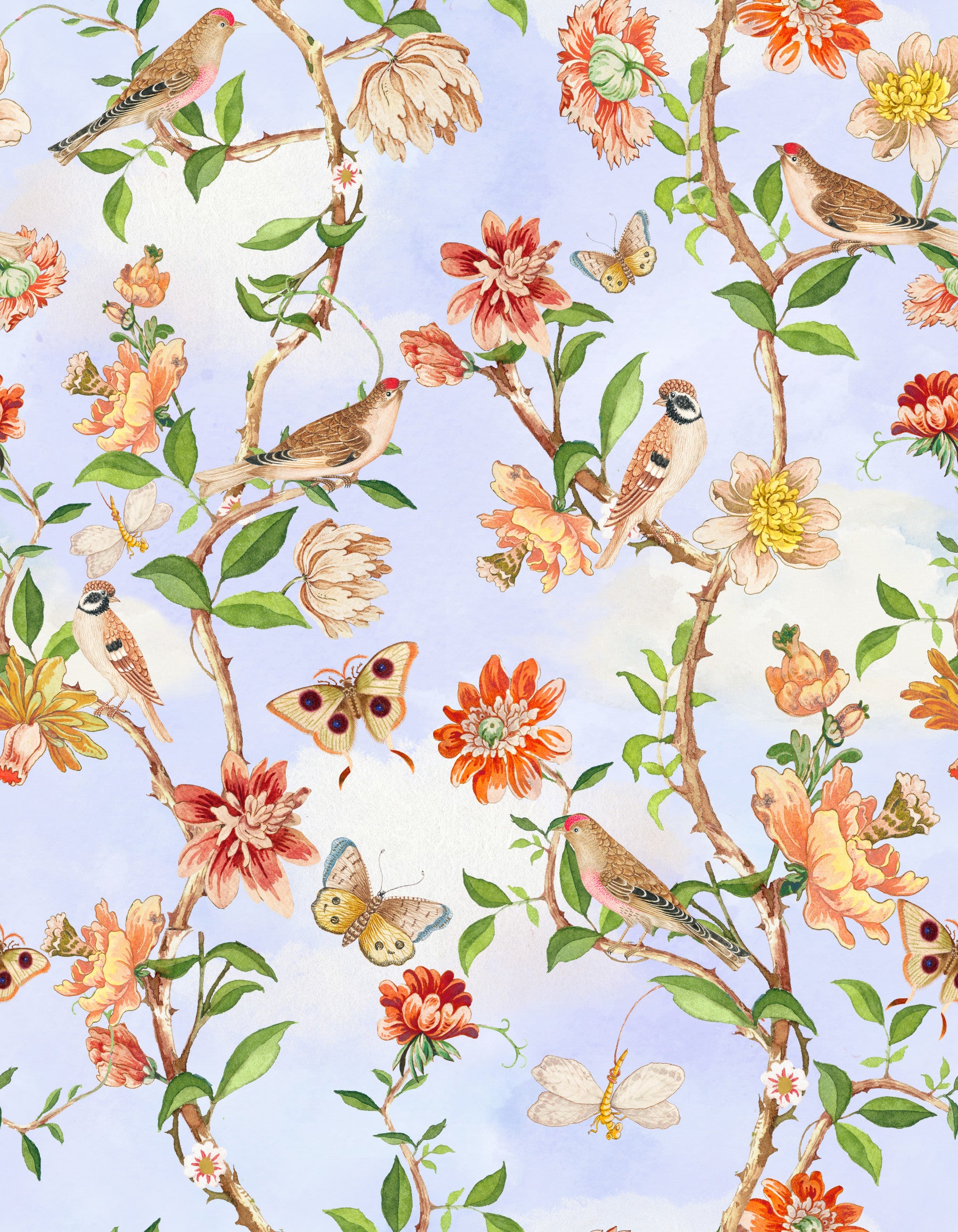 Immerse yourself in a world of enchanting flora and fauna with this breathtaking wallpaper. Watercolor birds, meticulously detailed, share their habitat with brilliantly colored blossoms and delicate butterflies, all rendered with an exquisite attention to detail. The pale blue sky background enhances the dreamlike quality of the scene. This wallpaper is perfect for those seeking to add a touch of magic and elegance to their home decor, creating a tranquil and captivating atmosphere in any room.
