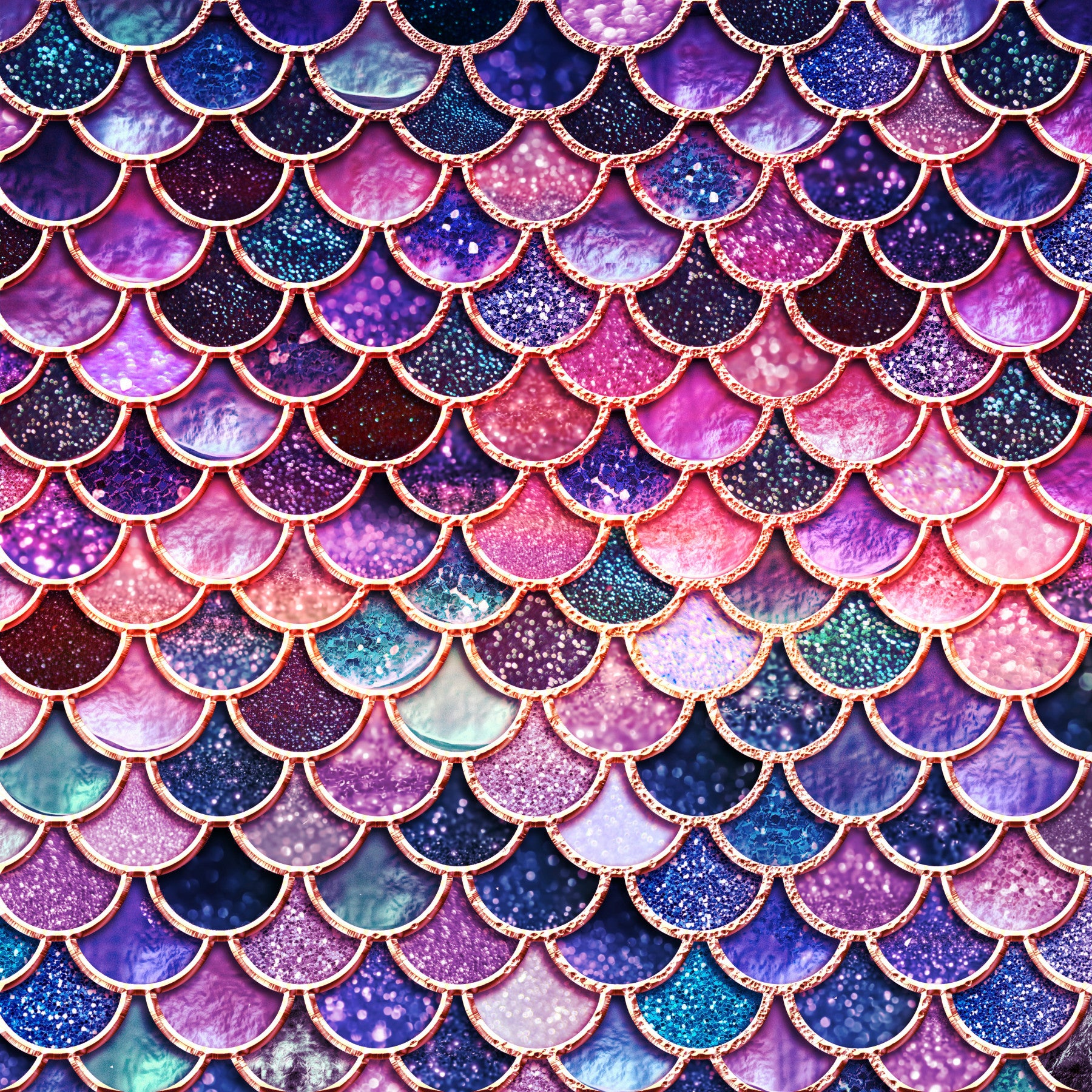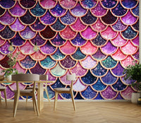 Bring underwater magic to your room with this stunning wallpaper for walls. This pattern mimics beautiful mermaid scales in captivating colors. Watch as shimmering pinks fade into deep blues and purples. The rose gold accents add a touch of luxury. This playful design will add intrigue to a girl's bedroom or a teen's room. This wallpaper creates a fun, modern look. Let this statement piece enhance your interiors and inspire dreams of the ocean.