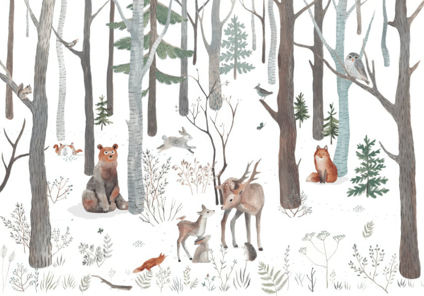Bring the enchantment of a white forest to your child's room with a forest wall mural. A good candidate for kids' room wallpaper, uploading this gentle forest whimsy of friendly bears, shy deers, and foxes running about happily will invite young imaginations to play on silver trees. Each brush stroke brings warmth to the fantasy woods, as it guarantees an adventure background and allows leafy lair seclusions to speak silently of friendship. It teaches the value of natural beauty and provides a serene area where the young can dream and play. An endless, new-to-discover wonderland covey of creatures or hiding spots in their forest playground, as found by the children every day.
