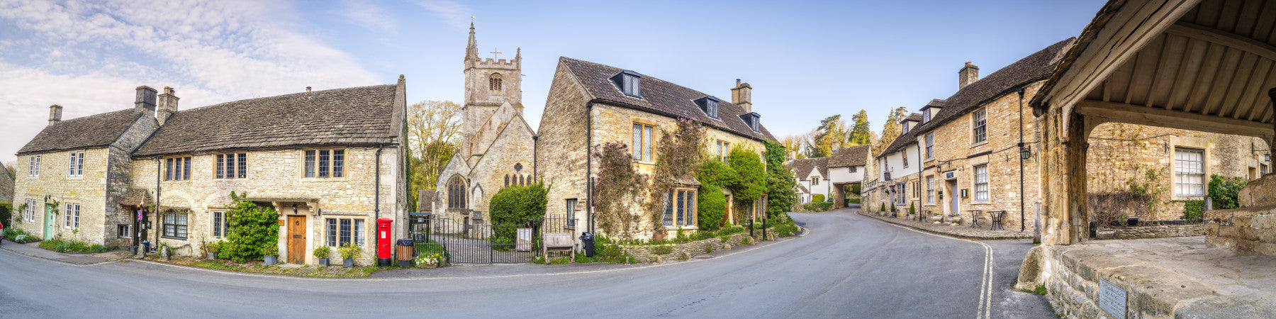 A beautiful panoramic view of a charming English countryside village.