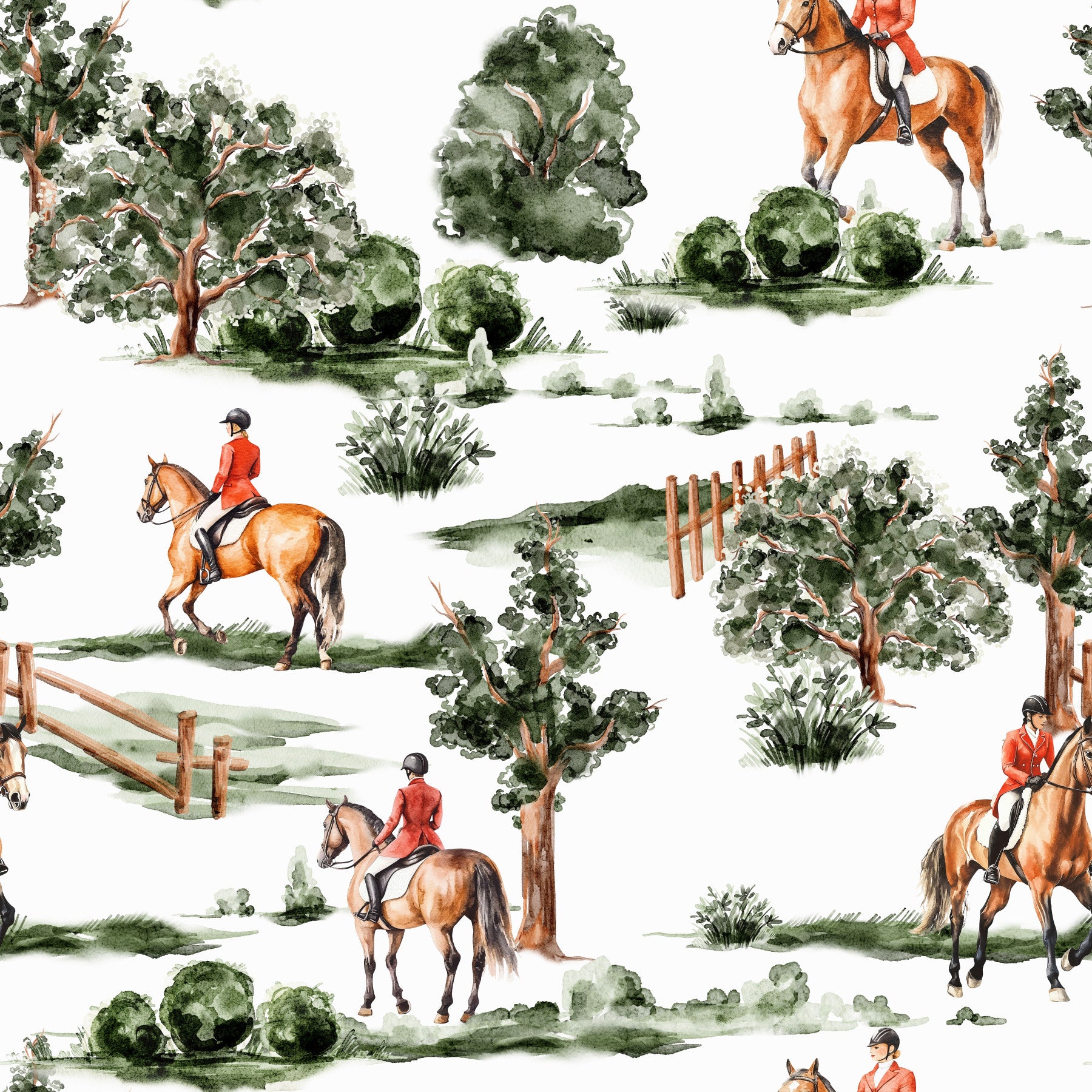 Bring the spirit of the hunt to your interiors with this graceful wallpaper by Uta Naumann. Watch riders connect with nature in a serene landscape. The watercolor style delivers an artistic, gentle touch. Earthy browns and soft greens offer a tranquil visual. This wallpaper for walls brightens living rooms, bedrooms, and home offices with a natural, sophisticated charm. The classic scene merges effortlessly with modern and traditional decor, crafting an inspiring and refined atmosphere. The detailed illustration adds a custom art piece.