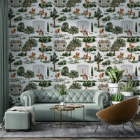This sophisticated wallpaper design highlights equestrian riders in traditional red jackets, elegant horses, and stately British manor houses set among lush countryside greenery. The watercolor style adds depth and vintage refinement, celebrating the traditions of hunting, horse riding, and aristocratic rural life. A perfect choice for interiors seeking timeless luxury and heritage charm, it evokes the atmosphere of English estates and countryside grandeur. Created by Uta Naumann, this design transforms walls into a window of classic elegance and equestrian spirit.