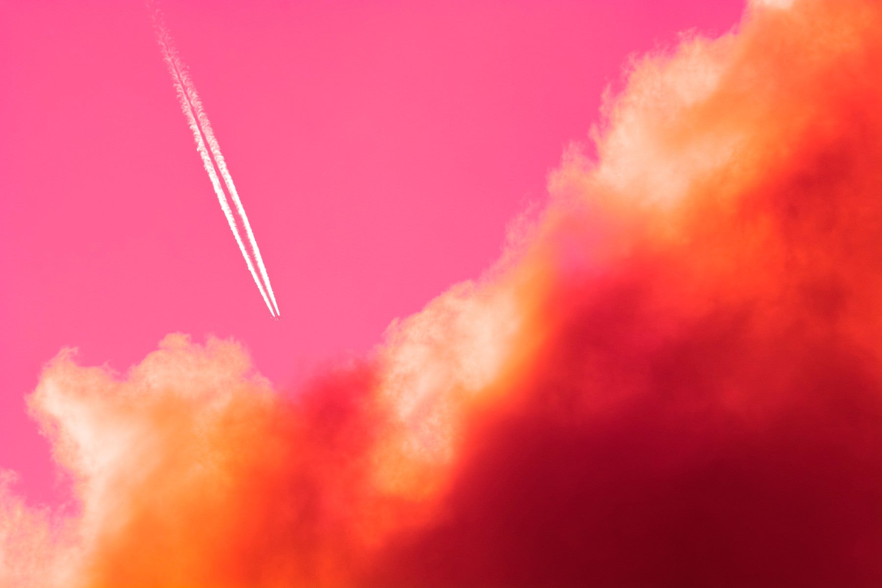 Soar into a world beyond the ordinary with Escape a vibrant wallpaper that captures the essence of freedom and adventure. Imagine yourself breaking free from the constraints of daily life, ascending into a boundless, cotton-candy sky. A stark white contrail slices diagonally across a vivid pink canvas, a visual metaphor for a journey taken, a destination sought. The fiery hues of crimson and sunset orange swirl within the fluffy, textured clouds, adding depth and dynamism to the composition. More than just a background, 'Escape' is an invitation to dream, to explore, and to embrace the possibilities that lie beyond the horizon. Let this uplifting image transform your device into a portal, reminding you to always seek your own escape, your own path to the extraordinary.