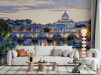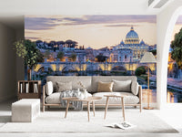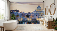 Transform your space with a view of Rome at twilight. This enchanting wallpaper for walls captures the city's iconic architecture bathed in the warm glow of sunset. The design features the Tiber River reflecting the illuminated St. Peter's Basilica and the ancient bridges spanning the water. Soft pinks, blues, and golds create a serene and luxurious atmosphere, ideal for a living room, dining room, or bedroom. Let the timeless beauty of Rome infuse your home with history and elegance. This design creates a sophisticated accent, turning any wall into a picturesque escape.