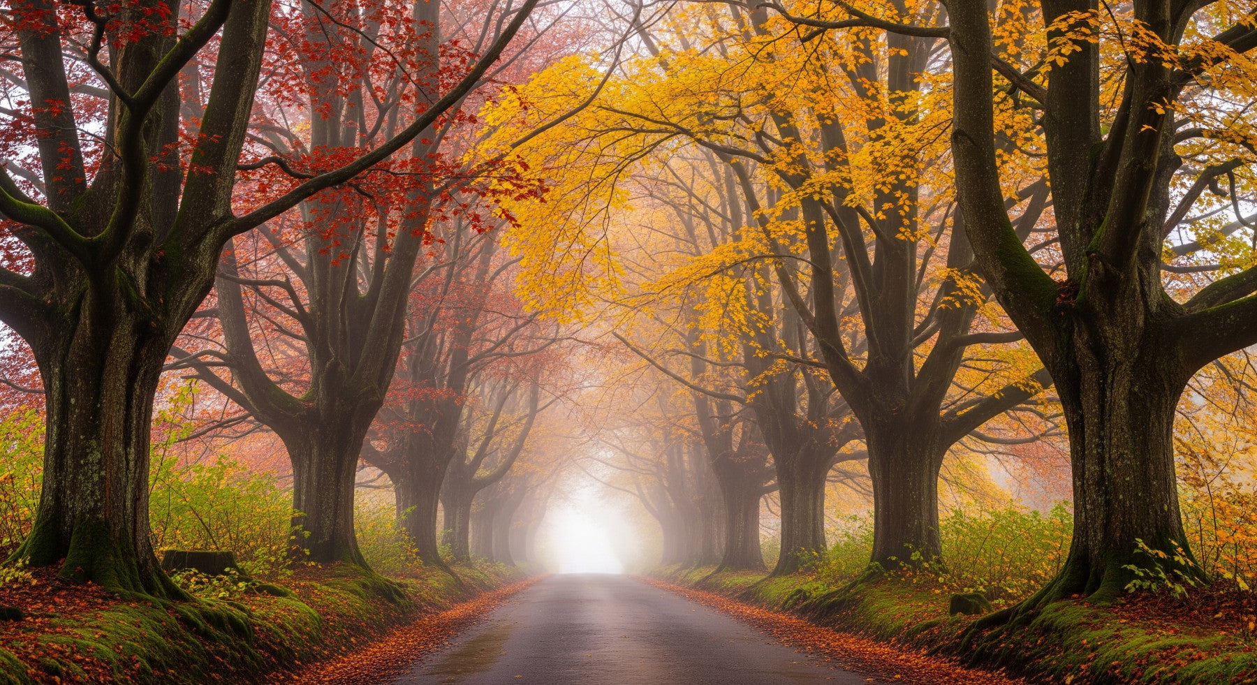 Ethereal fall road wallpaper with autumn trees and misty path