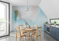 This beautiful abstract wallpaper for walls brings serene calm to any room. Painterly brushstrokes create a gentle, textured surface, mimicking a soft art canvas. Its ethereal style features a soothing color palette of sky blues, pristine whites, and delicate blush accents, blending seamlessly across the design. This elegant wallpaper works perfectly in bedrooms, promoting relaxation, or in living rooms and nurseries to establish a peaceful ambiance. Consider it for quiet reading nooks or serene home offices. It enhances interior spaces by introducing a sophisticated yet understated artistic touch, inviting tranquility and visual lightness into your home. The fluid blend of colors offers a soft, expansive feel, making rooms feel more open and airy.
