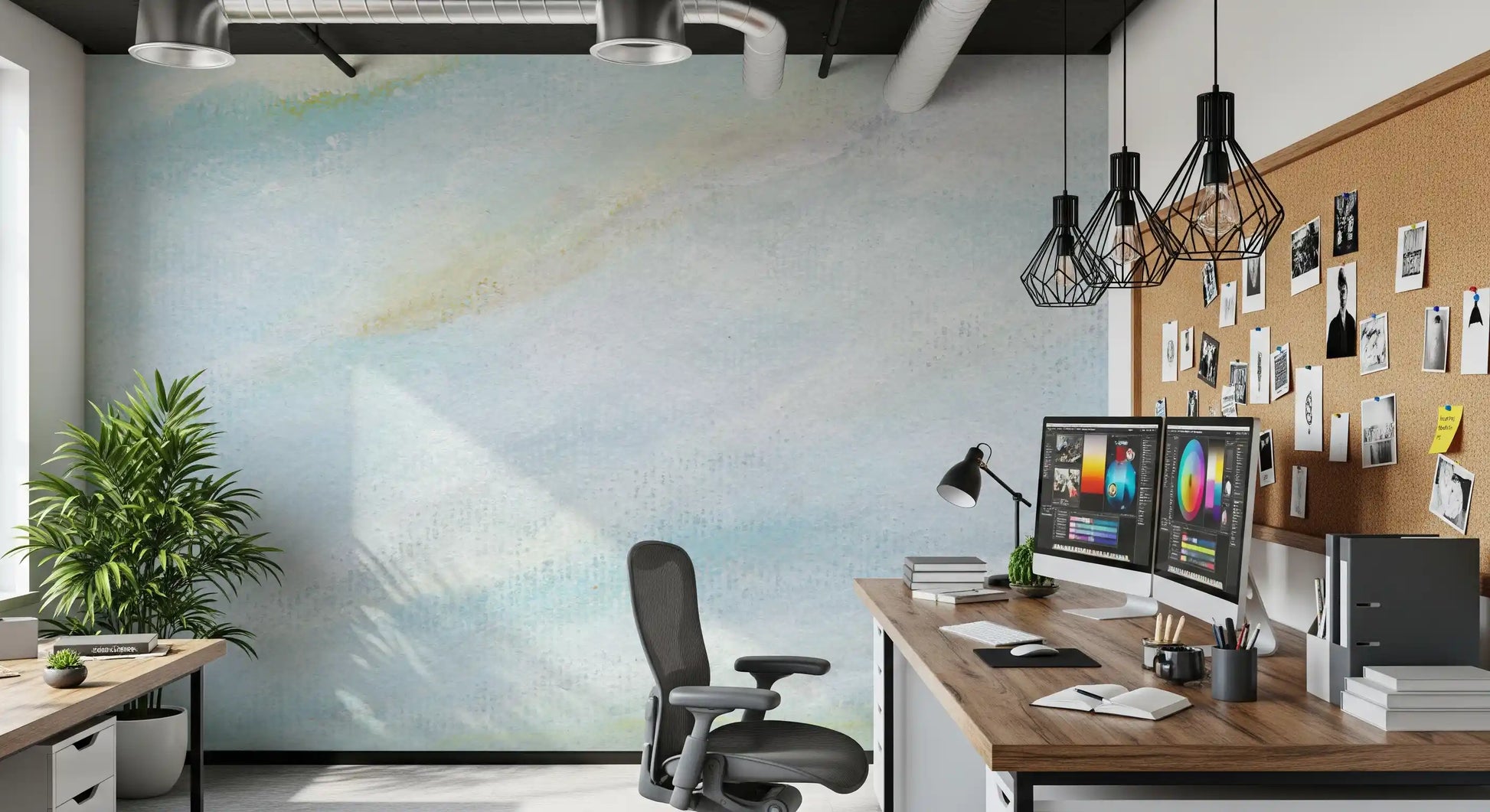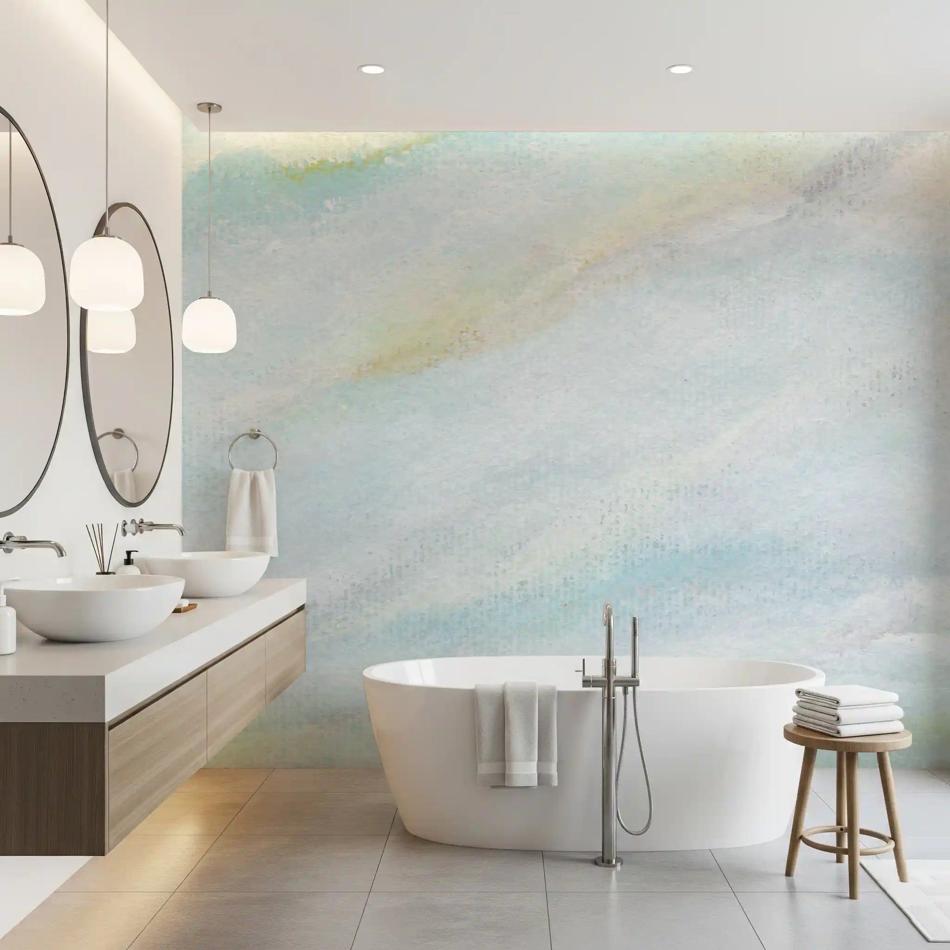 Transform your living space with this serene and captivating wallpaper for walls. Its delicate brushstrokes and ethereal painterly style create an atmosphere of tranquil calm. Soft washes of muted blue, gentle white, and subtle hints of pale yellow blend seamlessly across the surface, reminiscent of a peaceful, cloudy sky at dawn. The textured aesthetic adds depth and an artistic touch to any room. This design brightens bedrooms, fosters focus in home offices, and brings a spa-like serenity to bathrooms. It effortlessly enhances modern minimalist interiors or complements relaxed, Scandinavian-inspired decor by introducing a quiet elegance and a sense of open spaciousness.