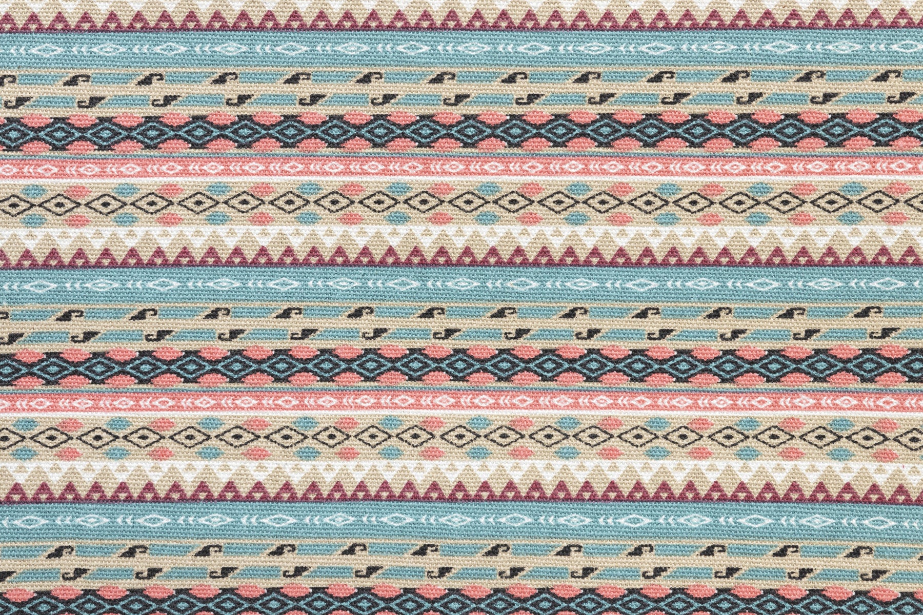 Elevate your space with this chic wallpaper for walls. It showcases a fascinating array of horizontal stripes using geometric and organic shapes. Shades of coral, beige, teal, and black create a calming yet subtly energetic feel. The design features rows of triangles, diamonds, and stylized motifs, offering a hand-crafted textile vibe. This pattern blends seamlessly into living rooms, bedrooms, or hallways. It's a wonderful option to bring a touch of worldly elegance and visual interest to your home. The warm and cool tones work well with both modern and vintage decor.