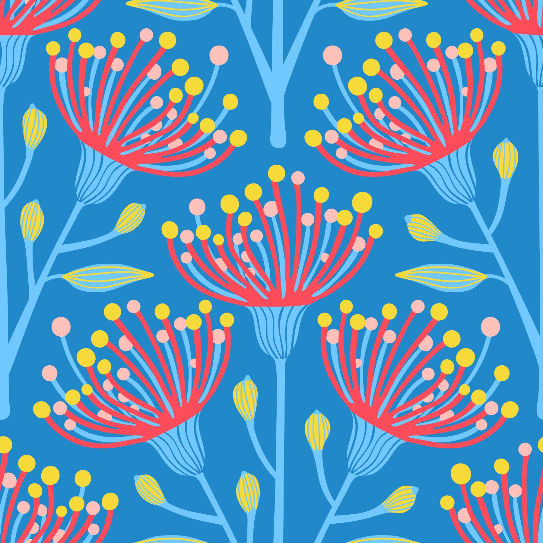 Immerse yourself in the vibrant energy of this striking Eucalyptus floral botanical wallpaper that bursts with life against a bright blue backdrop. This botanical pattern features stylized eucalyptus blooms in a captivating mix of light icy blue, bold red, cheerful yellow, and delicate pink hues. The interplay of colors creates a visually stunning and uplifting atmosphere, perfect for adding a touch of modern artistry to any space, and wonderful for those looking to introduce a burst of color and character into their homes. This meticulously crafted botanical pattern offers a playful yet sophisticated charm. This pattern design is also available in Other Colourways too! Original wallpaper pattern design by Jackie Tahara of UnBlink Studio.