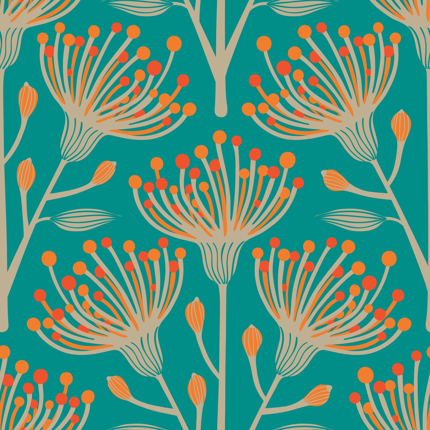 Bring warmth and vibrancy into your space with our "Eucalyptus" floral botanical wallpaper. Set against a bright turquoise backdrop, this design features stylized eucalyptus blooms in a delightful palette of bright orange, burnt orange and sandy beige. The botanical theme is subtly playful, creating a calming yet cheerful atmosphere. The artful arrangement of floral elements evokes a sense of botanical beauty and Summertime joy, transforming any room into a tranquil and inviting haven. The gorgeous warm color palette and simple, elegant design make this wallpaper ideal for adding a touch of nature-inspired serenity to your living room, bedroom, or any space that craves a refreshing makeover. This pattern design is also available in Other Colourways too! Original wallpaper pattern design by Jackie Tahara of UnBlink Studio.