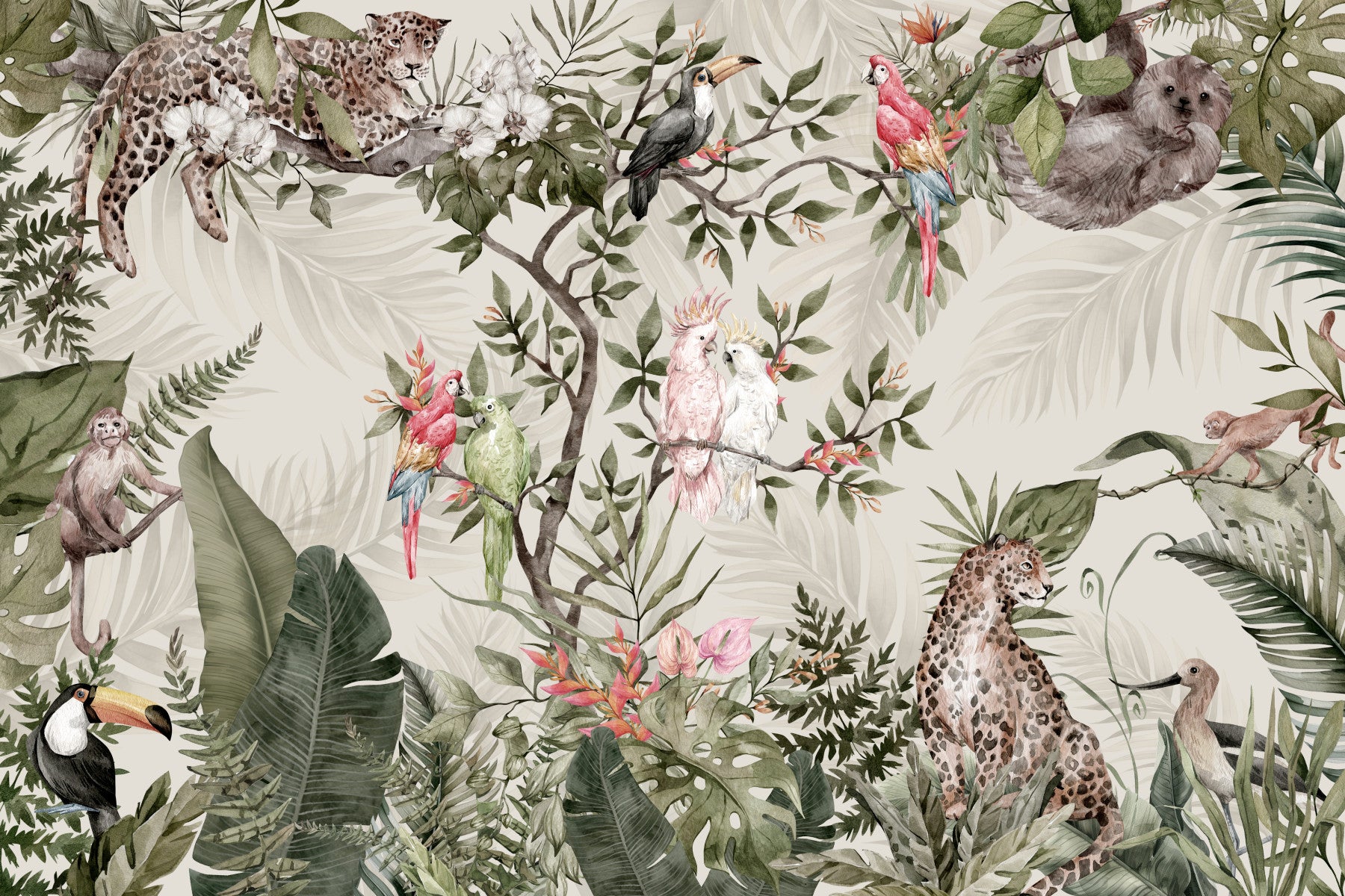 Bring a tranquil rainforest into your home with this beautiful wallpaper for walls. It presents jungle animals among tropical foliage. The watercolor design, with soft beige, cream, and green tones, creates a relaxing atmosphere. Ideal for a bedroom, living room, or nursery, this wallpaper adds a touch of nature's elegance. It lends itself to both modern and classic interiors.