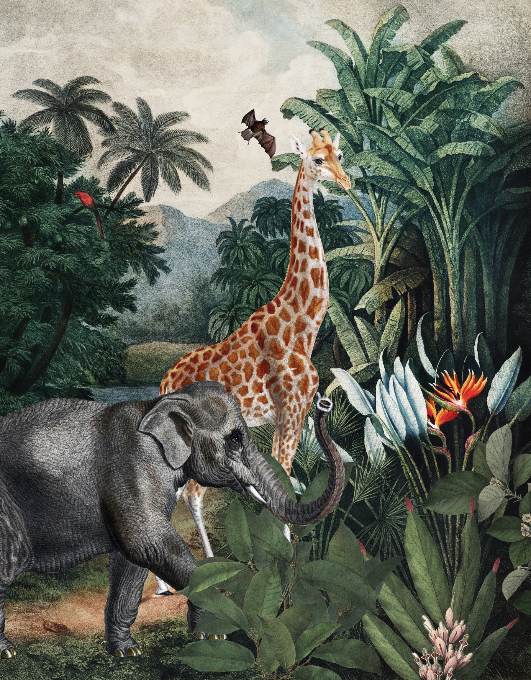 Transform your space into a hidden paradise with this captivating wallpaper. A majestic giraffe and an elephant stand amidst a lush jungle landscape, surrounded by vibrant tropical foliage, exotic flowers, and birds. The detailed artwork blends vintage charm with modern sophistication, creating a serene and inviting atmosphere. The rich palette of greens, browns, oranges, and accents of red bring the exotic beauty of a tropical rainforest to life. Ideal for adding a touch of elegance and adventure to a living room, bedroom, or any space seeking a unique and luxurious touch. The detailed rendering of animals and flora creates a sense of depth and tranquility.