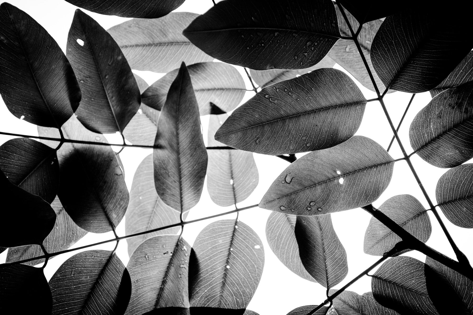 Step into a botanical study with "Experiments with Leaves I," a monochrome exploration of nature's artistry. This wallpaper captures a close-up perspective of leaves against a stark white background, highlighting the intricate vein patterns and subtle textures. The interplay of light and shadow creates a sense of depth, drawing the eye to the organic shapes and delicate details. Water droplets cling to some of the leaves, adding a touch of freshness and realism. The composition feels both scientific and artistic, reflecting the experimental nature of the piece. Perfect for adding a touch of sophisticated natural beauty to your digital space, this design evokes a sense of calm and quiet contemplation. The high-contrast black and white palette allows it to complement a wide range of screen types and color schemes, making it a versatile choice for any user seeking a blend of modern minimalism and natural detail.