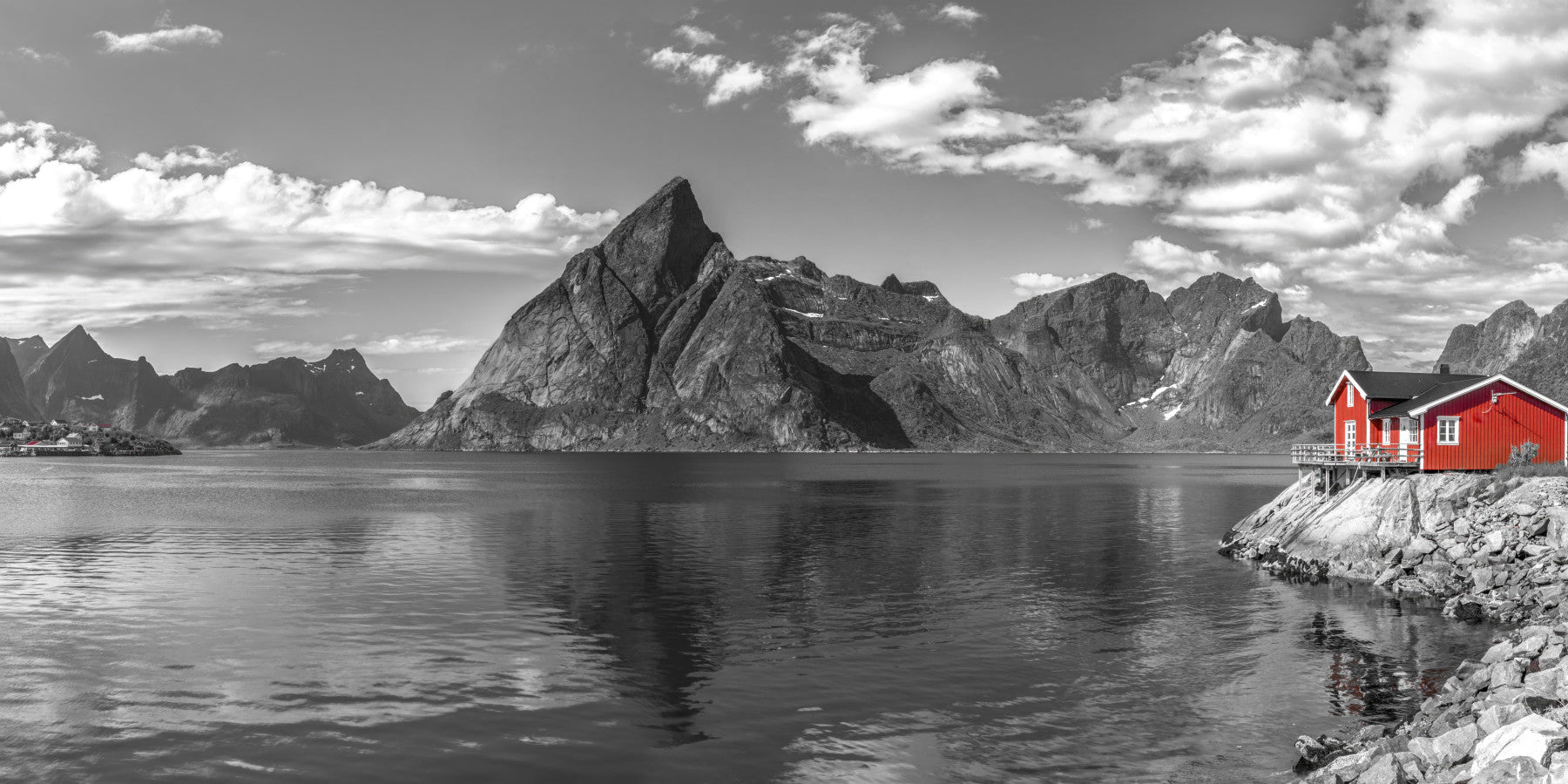 Norwegian fjord, Lofoten, Norway. Immerse your space in the serene beauty of the Norwegian Fjords. This striking wall décor captures the raw, majestic power of nature, featuring towering monochrome mountains reflected in the tranquil waters. A vibrant red cabin perches on the rocky shoreline, providing a vivid focal point against the stark landscape, infusing the scene with warmth and character. The interplay of light and shadow accentuates the rugged textures of the mountains and the subtle ripples of the water, creating a captivating visual experience. Invite the spirit of adventure and the timeless allure of the Nordic wilderness into your home with this breathtaking piece, transforming any room into a sanctuary of peace and reflection.