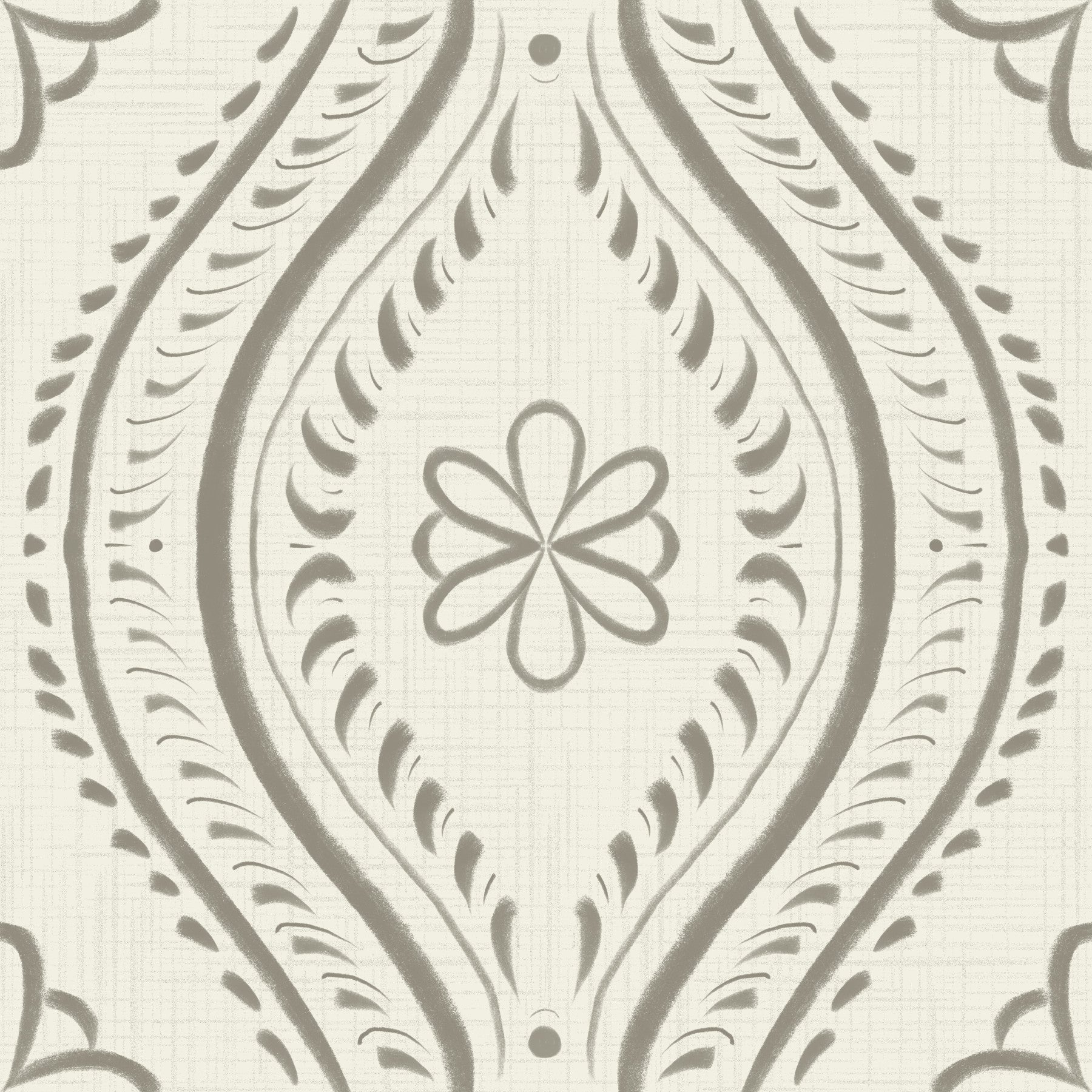Embrace understated elegance with this "Faded Ogee Damask - Bright - Laurel Oak" wallpaper. Subtle taupe-gray ogee patterns, reminiscent of classic damask, are delicately rendered against a soft, bright off-white linen-textured background. The slightly faded appearance lends a vintage charm, while the symmetrical design creates a sense of calm and sophistication. A central stylized floral motif adds a touch of organic beauty to the overall refined aesthetic. This wallpaper is perfect for creating a tranquil and stylish atmosphere in any room, bringing a touch of timeless elegance to your digital space.