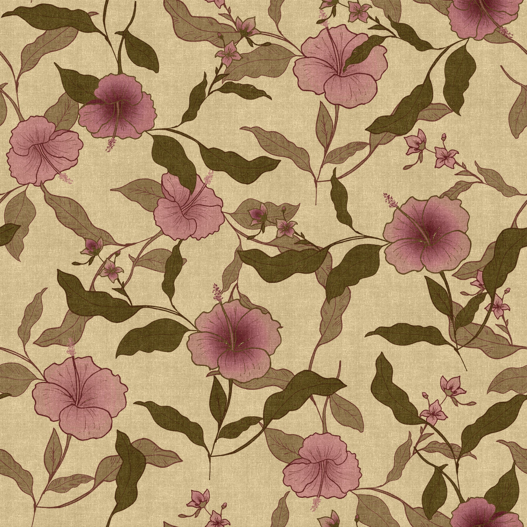 Vintage botanical print with sprawling hibiscus flowers and linen texture background.