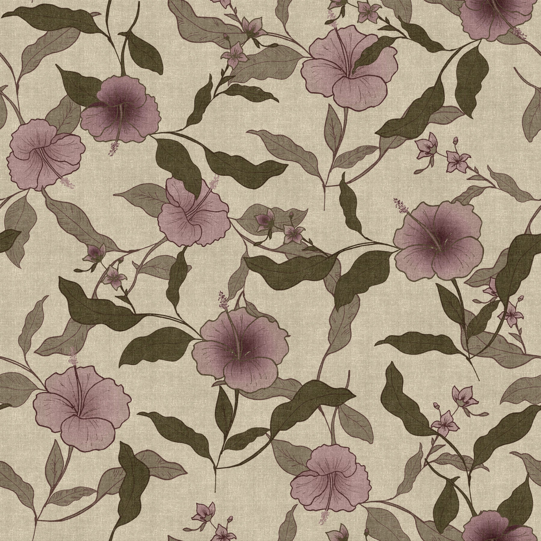 Escape to a bygone era with our "Faded Tropical Floral Vintage" wallpaper. This captivating design evokes the charm of vintage textiles, featuring elegantly rendered hibiscus blooms in muted mauve tones, intertwined with deep olive and sage leaves. The textural background mimics aged linen, lending an authentic vintage feel to any space. This wallpaper exudes a sense of serene nostalgia, perfect for creating a relaxing and inviting atmosphere. Ideal for bedrooms, living rooms, or accent walls, this design brings a touch of tropical paradise with a subtle, sophisticated twist. Transform your walls with this timeless design and create a space that feels both classic and contemporary.