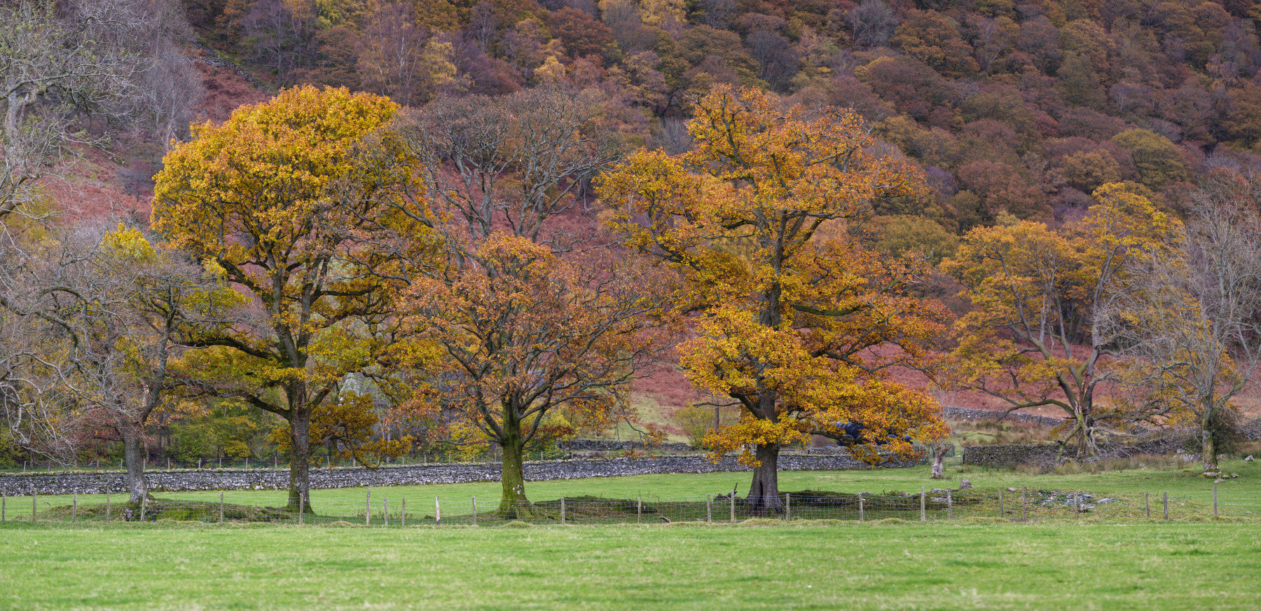 Lush green Fall Foliage Retreat Wall Mural grass foreground.
