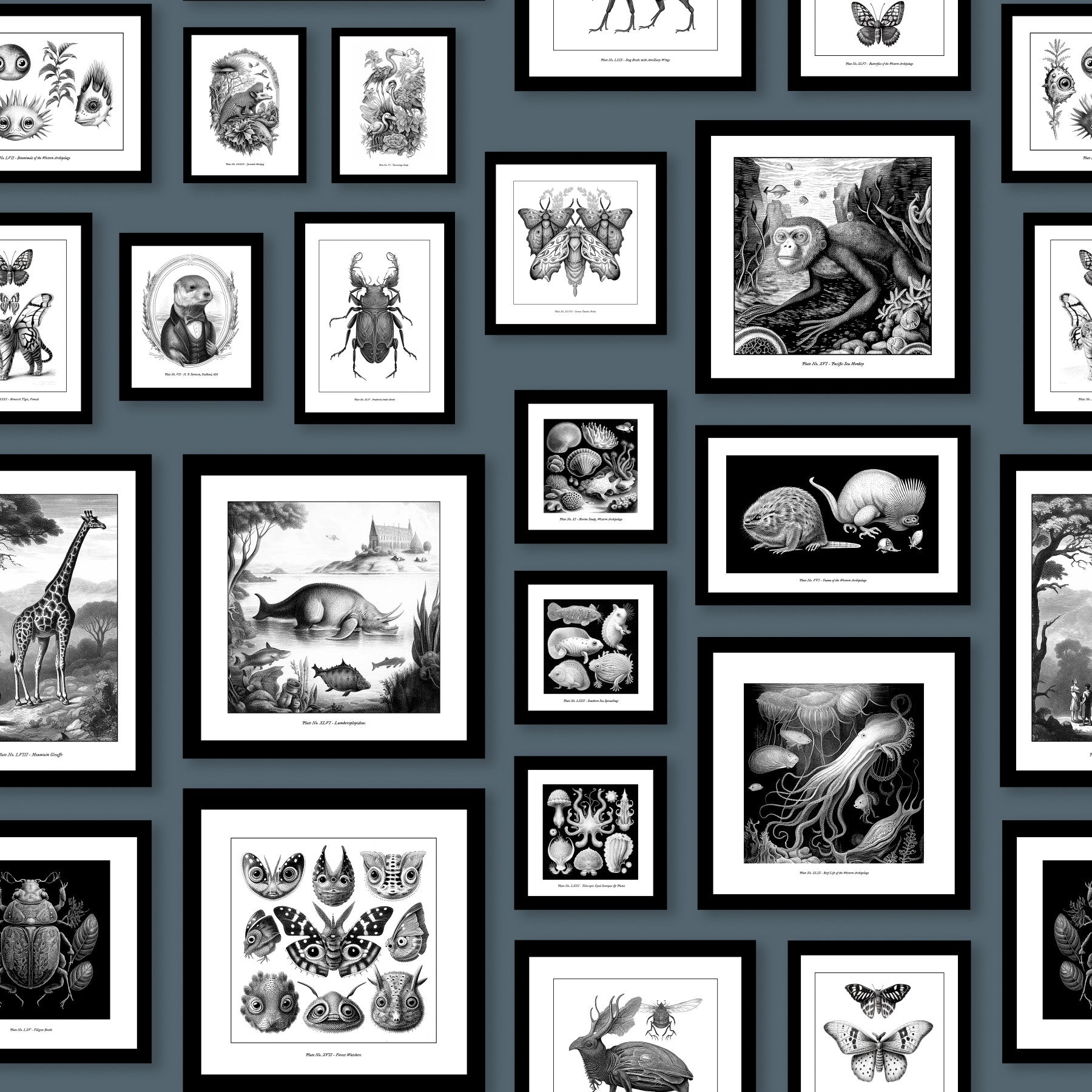 Introducing "Fantastic Creatures": a delightfully surreal wallpaper that puts a cool modern twist on traditional library aesthetics. Designed with an eye for the absurd, it depicts an intriguing world filled with charmingly fantastic creatures, which seem to leap right off your walls, inviting daydreaming and sparking imaginative conversation. A mischievous otter, central to the print, adds a whimsical explorer's touch that sets the mood. Brimming with beautifully strange insects and mysterious creatures heralding from the mythic world of the Western Archipelago, the salon style collection of framed scientific illustrations will lend a surprisingly stately feel to any room. Giving thought to the smallest details, this tastefully dark print seamlessly combines whimsy with sophistication to create a striking balance. As a lively alternative to ordinary wall coverings, the Fantastic Creatures wallpaper in Storm Blue perfectly adds a dash of the unexpected to your interior design.