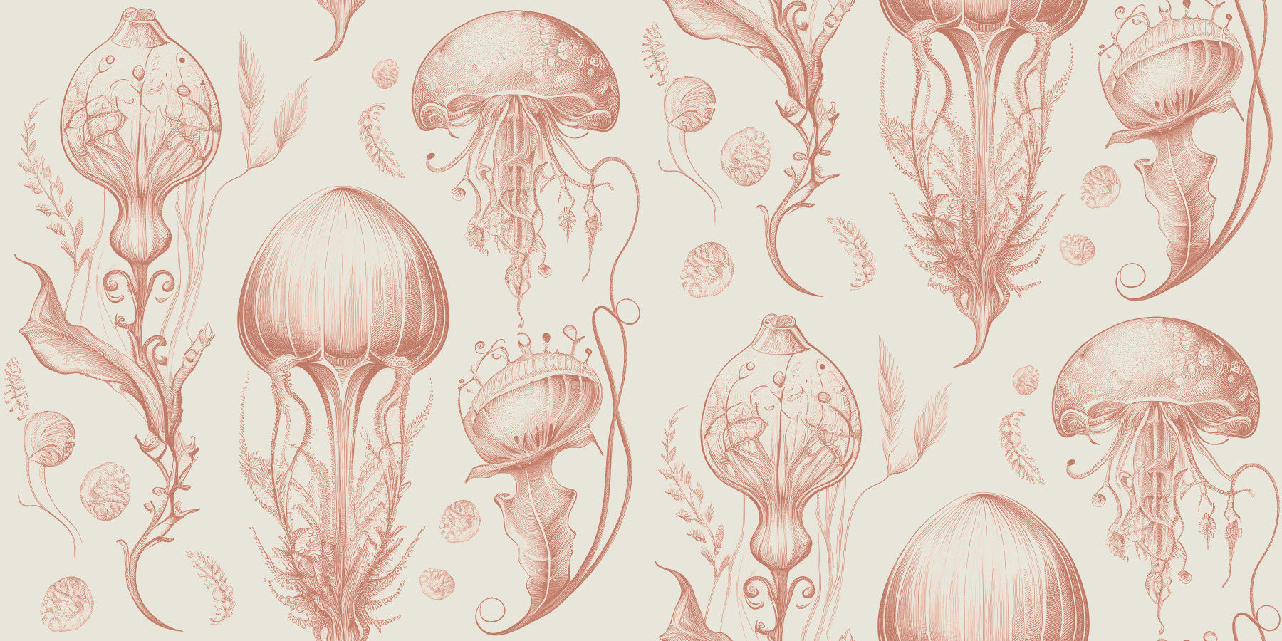 Immerse yourself in the ethereal beauty of "Fantastic Jellyfish - Peach & Cream," a captivating wallpaper that marries the charm of the sea with a touch of vintage elegance. Delicate, peach-toned jellyfish float serenely against a creamy backdrop, their intricate details meticulously rendered in a captivating sketch style. The design evokes a sense of dreamy tranquility, perfect for creating a calming and sophisticated atmosphere in any space. This enchanting pattern seamlessly blends the organic forms of marine life with a classic, refined aesthetic, making it a unique and eye-catching choice for your digital canvas.