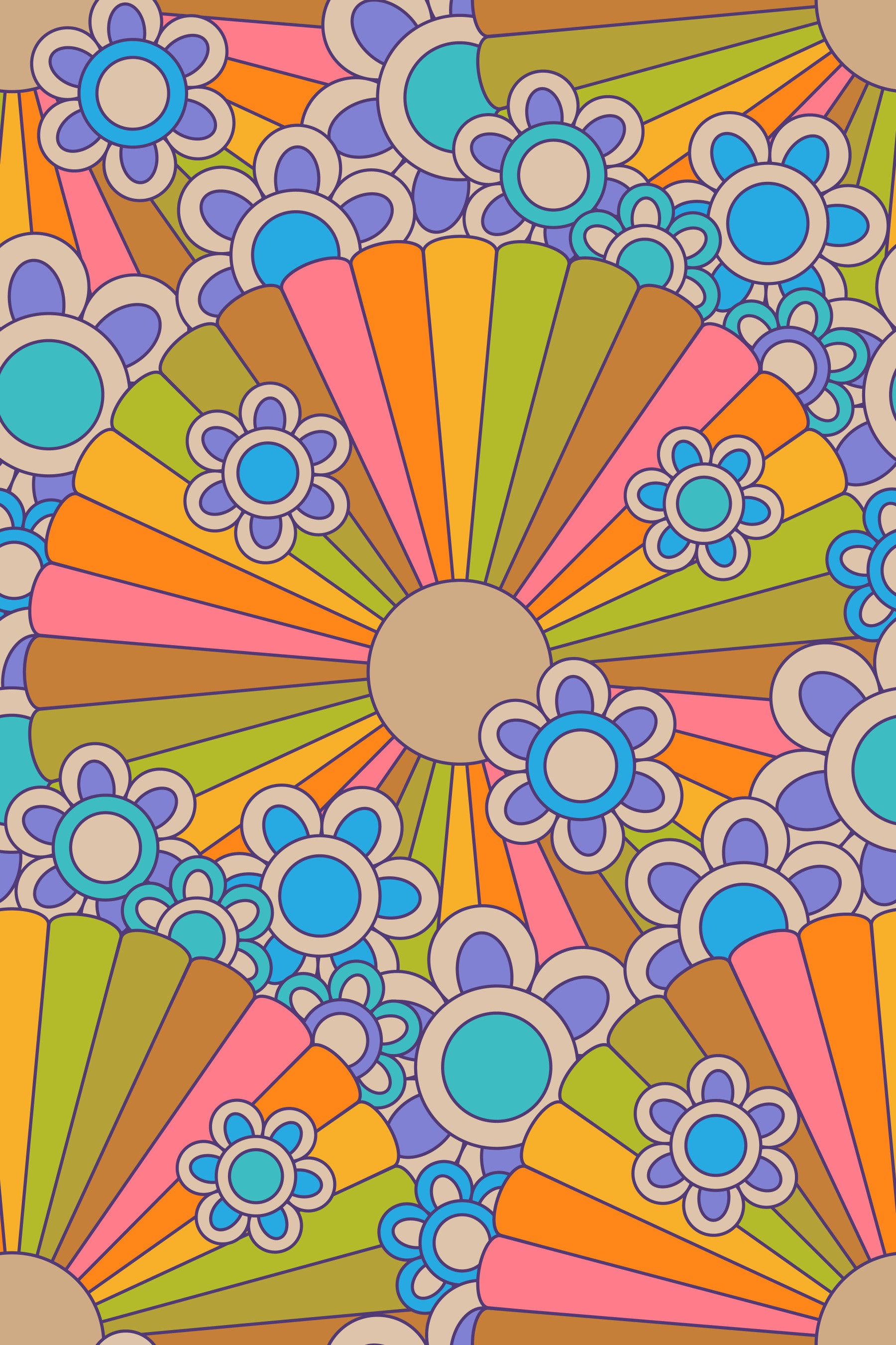Step back into the groovy psychedelic 1970s with this Far Out Flowers wallpaper featuring retro flowers and a bold sunburst pattern that radiates with energy. Groovy rainbow hues of orange, pink, yellow, green, purple and blue intertwine with earthy tones to create a radical optimistic vibe. Perfect for adding a touch of retro flair to any space, this wallpaper captures the fun, free-spirited and vibrant essence of the Seventies. Embrace the flower power and let this funky floral transform your walls into a vintage masterpiece. Original wallpaper pattern design by Jackie Tahara of UnBlink Studio.