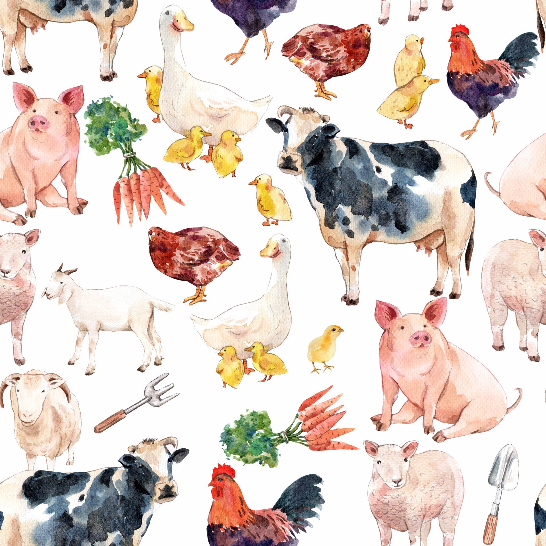 Bring rustic charm to your space with this delightful watercolor wallpaper by Uta Naumann. The design features a seamless pattern of farm animals like cows, pigs, sheep, and chickens, interspersed with carrots and gardening tools. Soft, muted tones of pink, brown, white, and yellow create a calm and inviting atmosphere. This versatile wallpaper for walls works beautifully in a nursery, kids' room, kitchen, or dining area. The watercolor style lends a hand-painted look, complementing farmhouse, country, or cottage-style interiors. It adds a playful yet sophisticated touch, ideal for creating a warm and welcoming home.