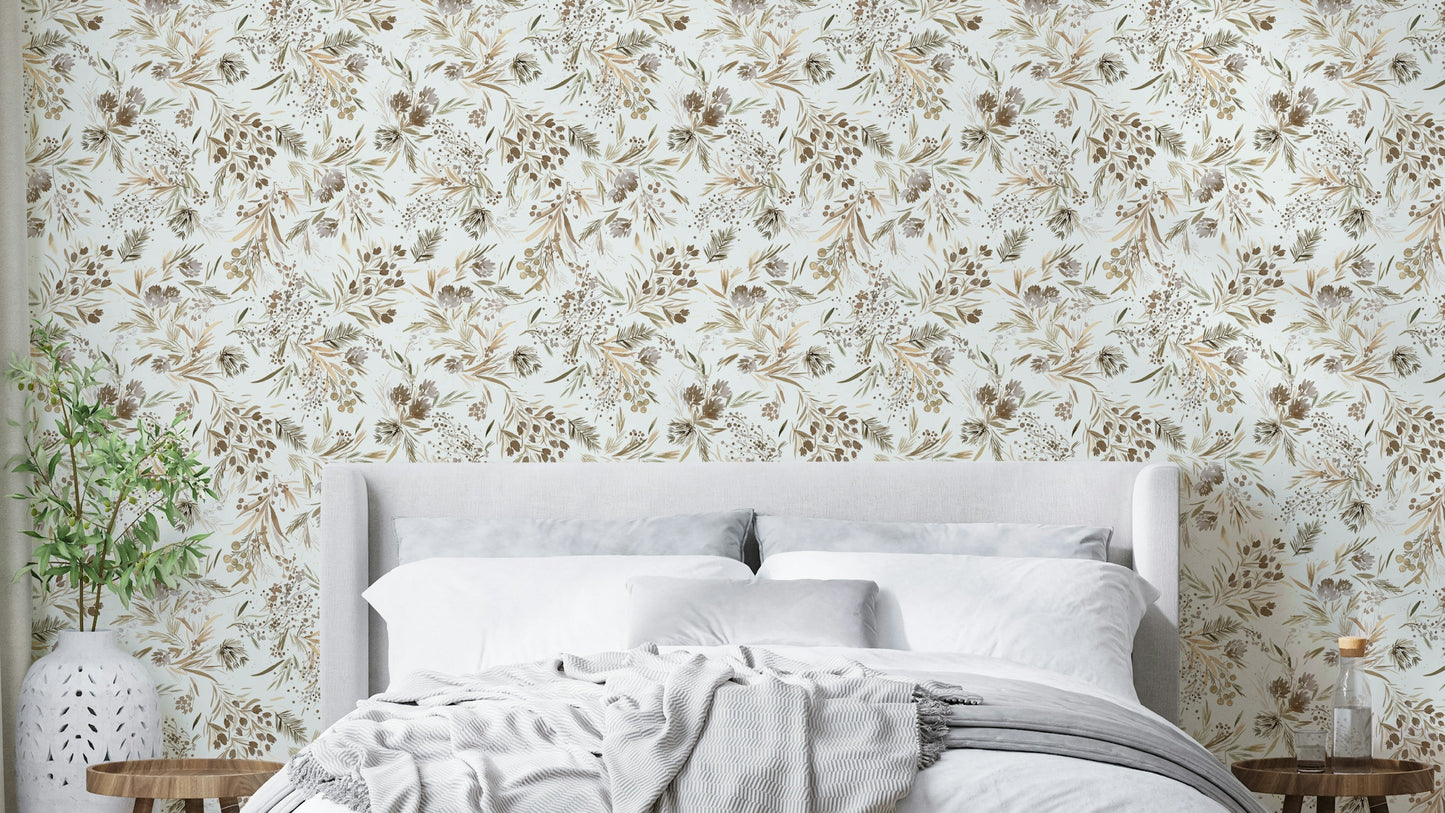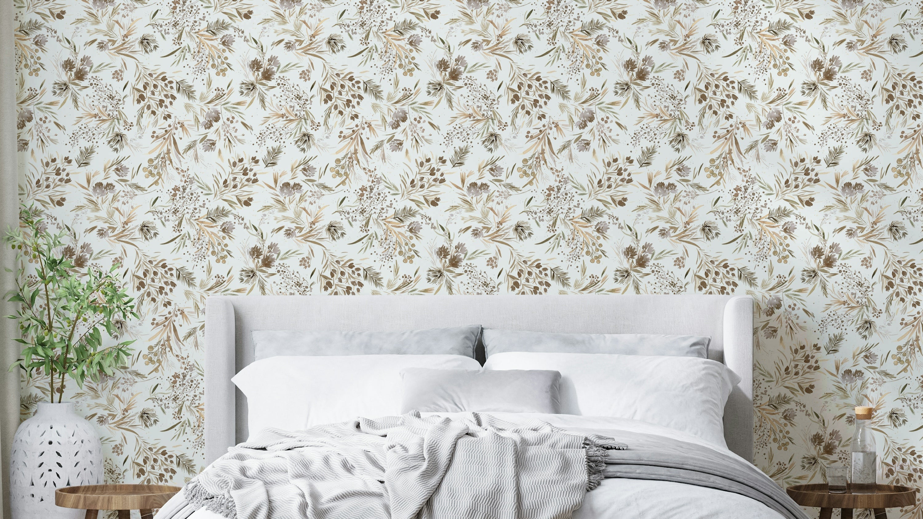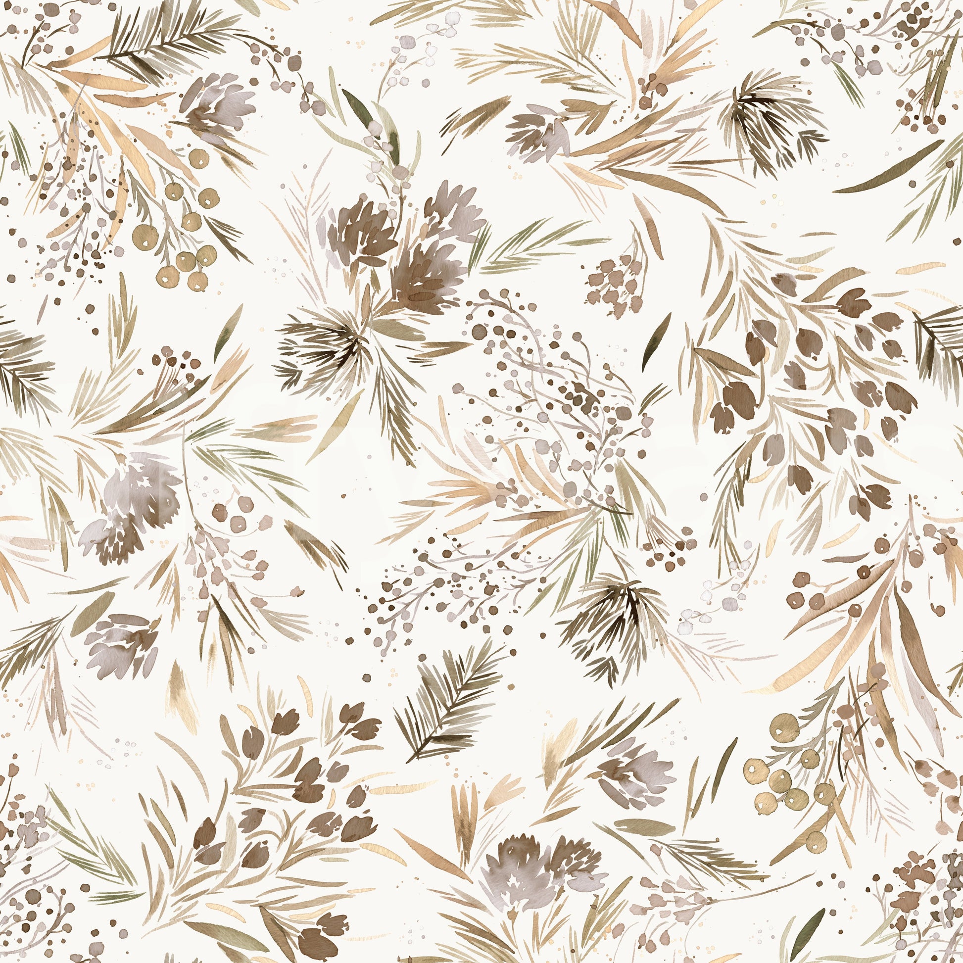 Embrace the understated elegance of this 'Festive Floral Minimal Plants Gold' wallpaper. Delicate watercolor botanicals in muted browns, golds, and greys create a serene yet celebratory atmosphere. Minimalist in its design, the wallpaper features a harmonious arrangement of stylized floral elements and sprigs, reminiscent of winter flora. The subtle gold accents add a touch of festive sparkle, making it perfect for adding a touch of refined holiday cheer or creating a year-round calming ambiance. This wallpaper offers a sophisticated and tranquil escape, ideal for both modern and traditional spaces.