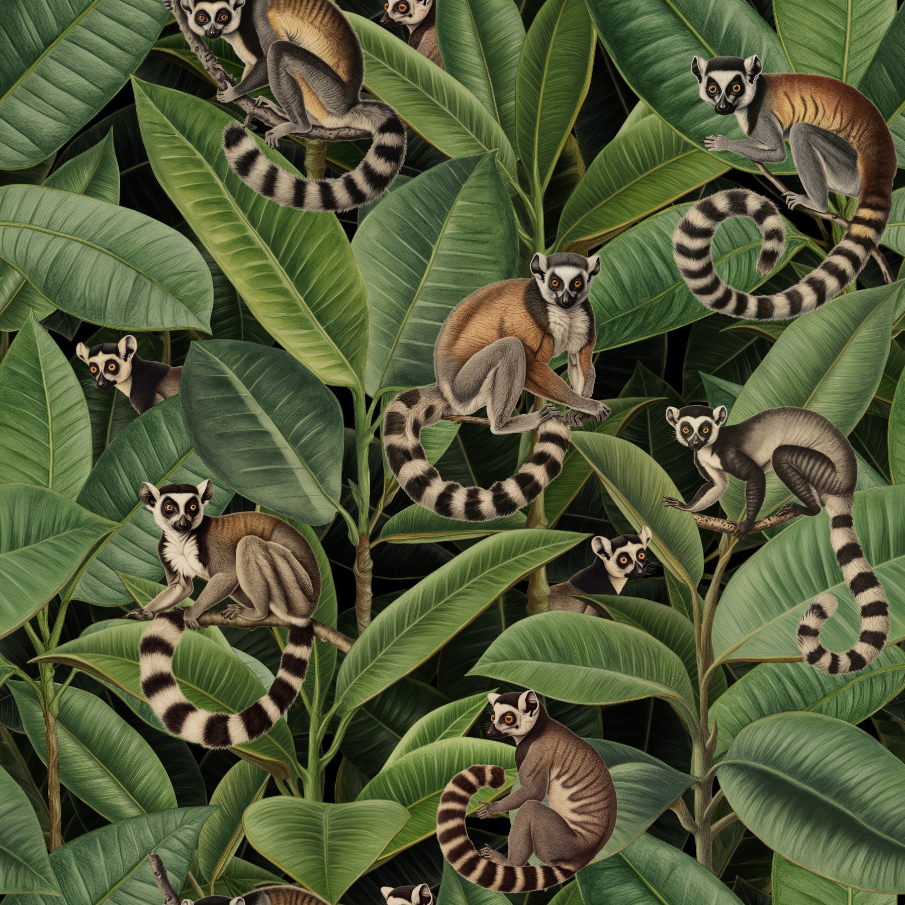 Adorable tropical lemurs nestled among vibrant green leaves. Perfect for nature enthusiasts and those looking to add a unique flair to their decor, this design captures the essence of a tropical getaway. Let these delightful lemurs inspire your everyday life and create tropical jungle vibes