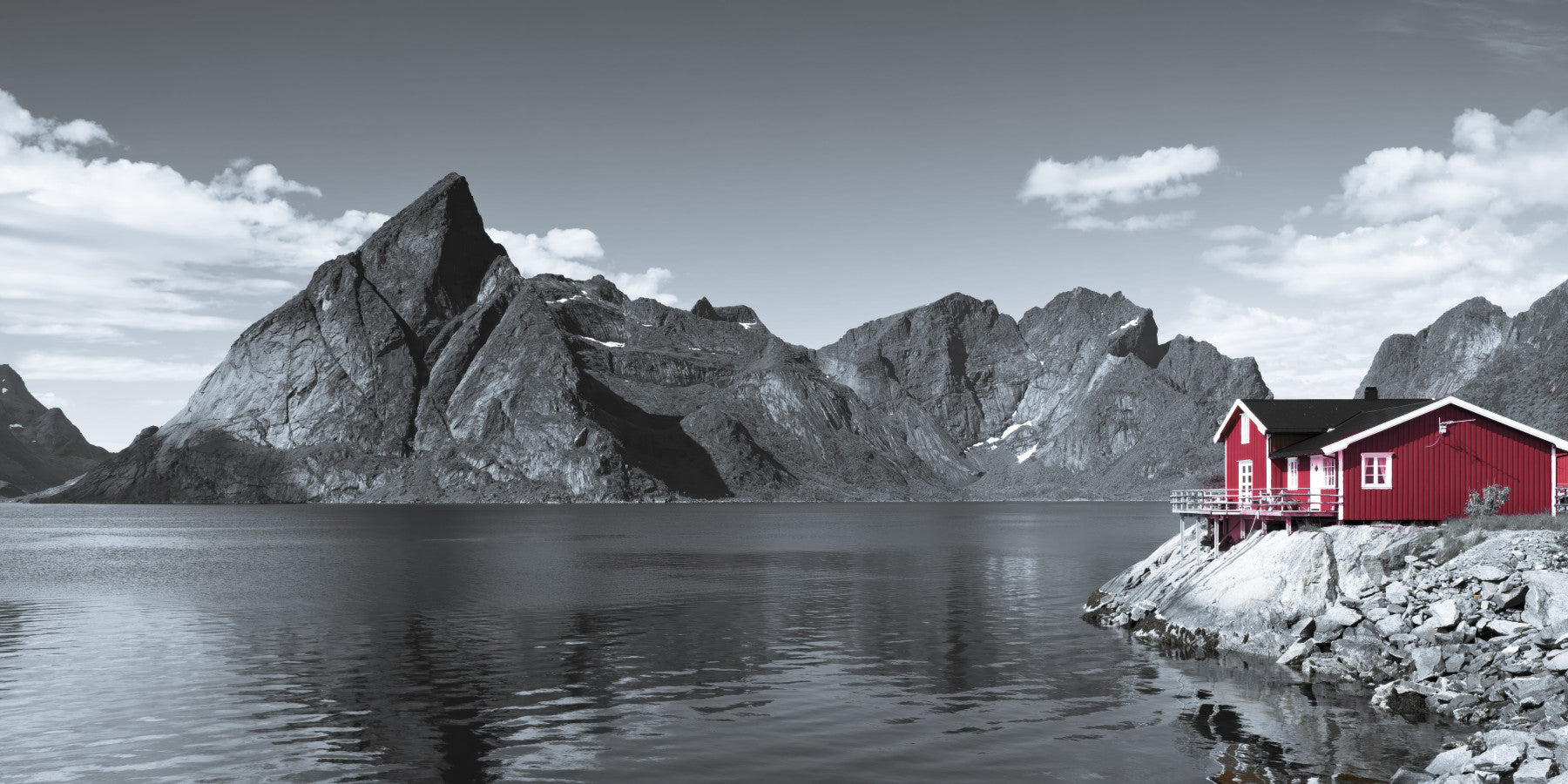 Selective color Fjord Home wallpaper mural with black and white mountain backdrop.