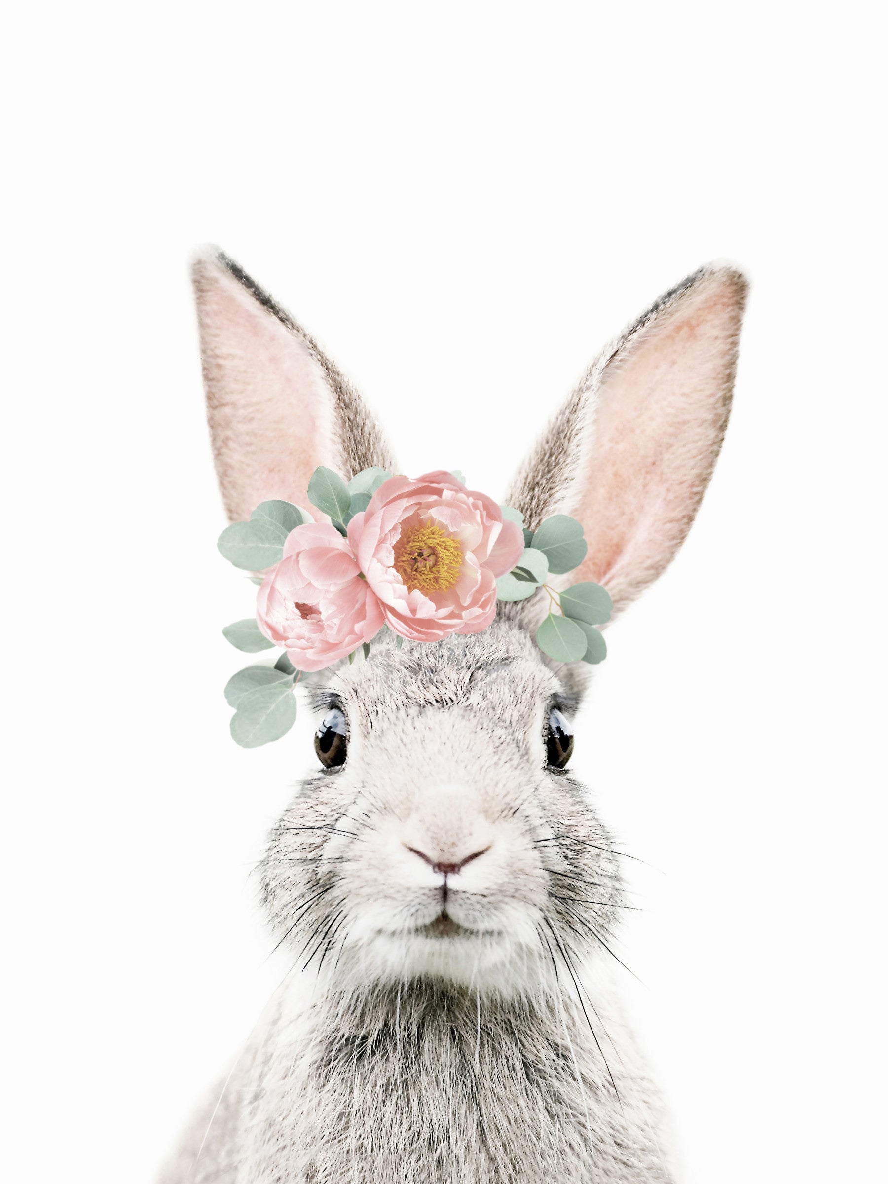 Welcome a touch of whimsy with this adorable bunny wallpaper for walls. A sweet bunny portrait, adorned with a delicate floral crown, brings a gentle charm to your space. The soft grey hues of the bunny, combined with blush pink flowers, create a calming effect. This design is ideal for a nursery, kids' room, or bedroom, lending a touch of sweetness and nature-inspired beauty. It complements interiors with a minimalist aesthetic.