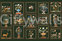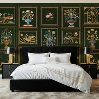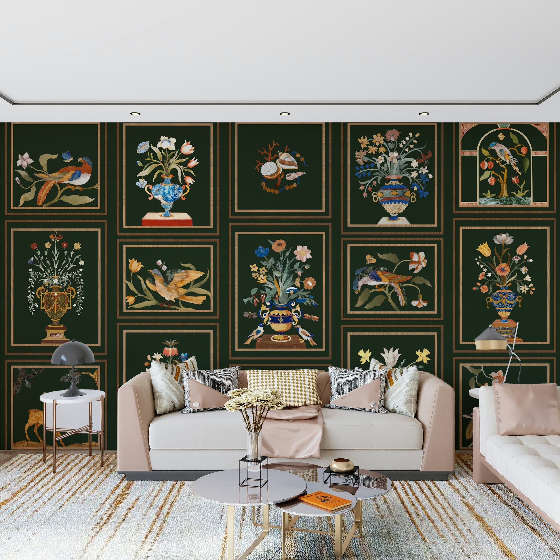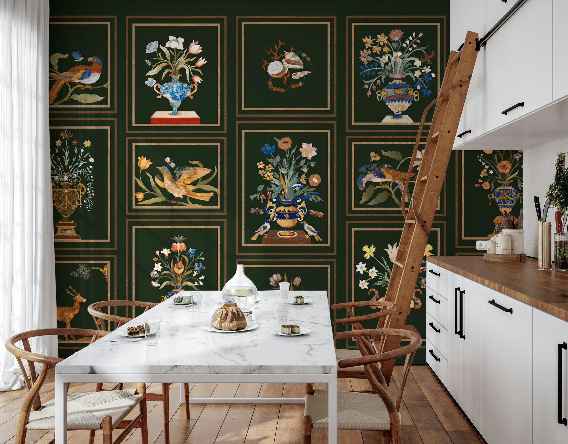 Elevate your interior with this elegant wallpaper for walls, reminiscent of a grand estate. Framed panels featuring birds and floral arrangements create a sophisticated, vintage feel. The detailed designs showcase a rich color palette of earthy browns, deep greens, blues, and muted oranges. Ideal for a dining room, living room, or hallway, the repeating pattern offers a luxurious touch, complementing classic and contemporary décor. This wallcovering brings artistic charm and timeless appeal to any space, transforming it into a gallery-like experience.