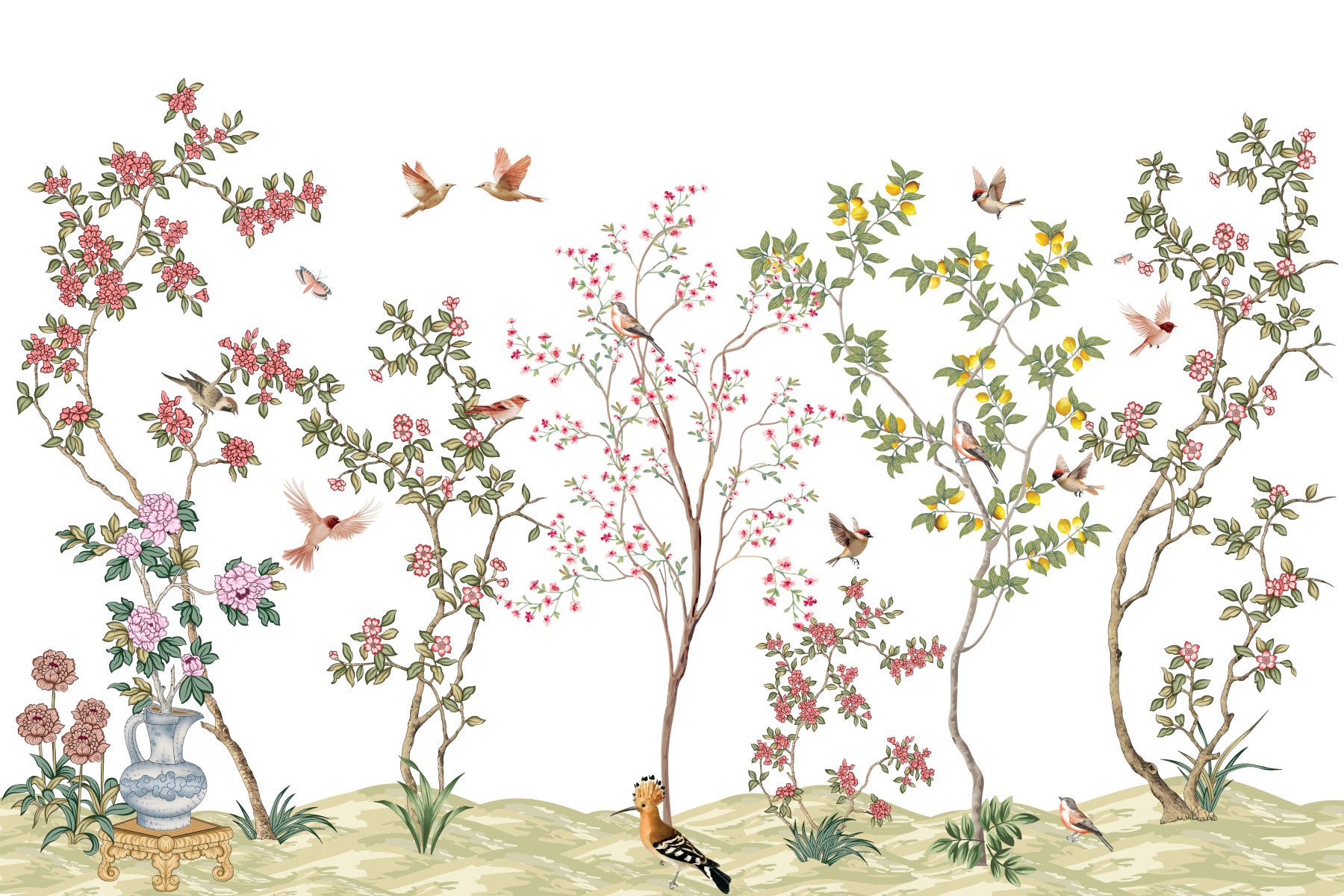 Adorn your walls with the delicate beauty of nature. This stunning wallpaper for walls displays flowering trees dotted with birds, butterflies, and a pitcher of flowers. The charming aesthetic suits any room and creates a calming atmosphere. Pastel tones enhance the sophisticated design, blending flawlessly with various interiors. Create a captivating feature wall in the dining room, bedroom, or living room to add beauty. Enhance the room and capture the eye of anyone who beholds it.