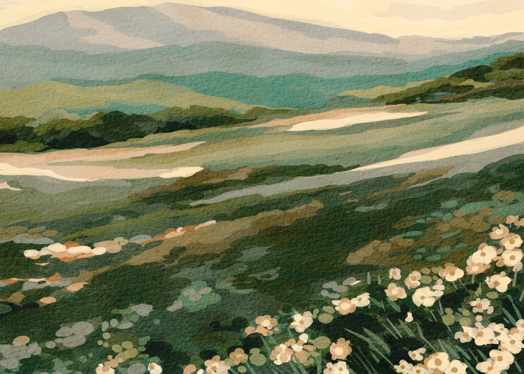 Artistic meadow vista wallpaper mural, verdant green slope, delicate flowers.