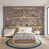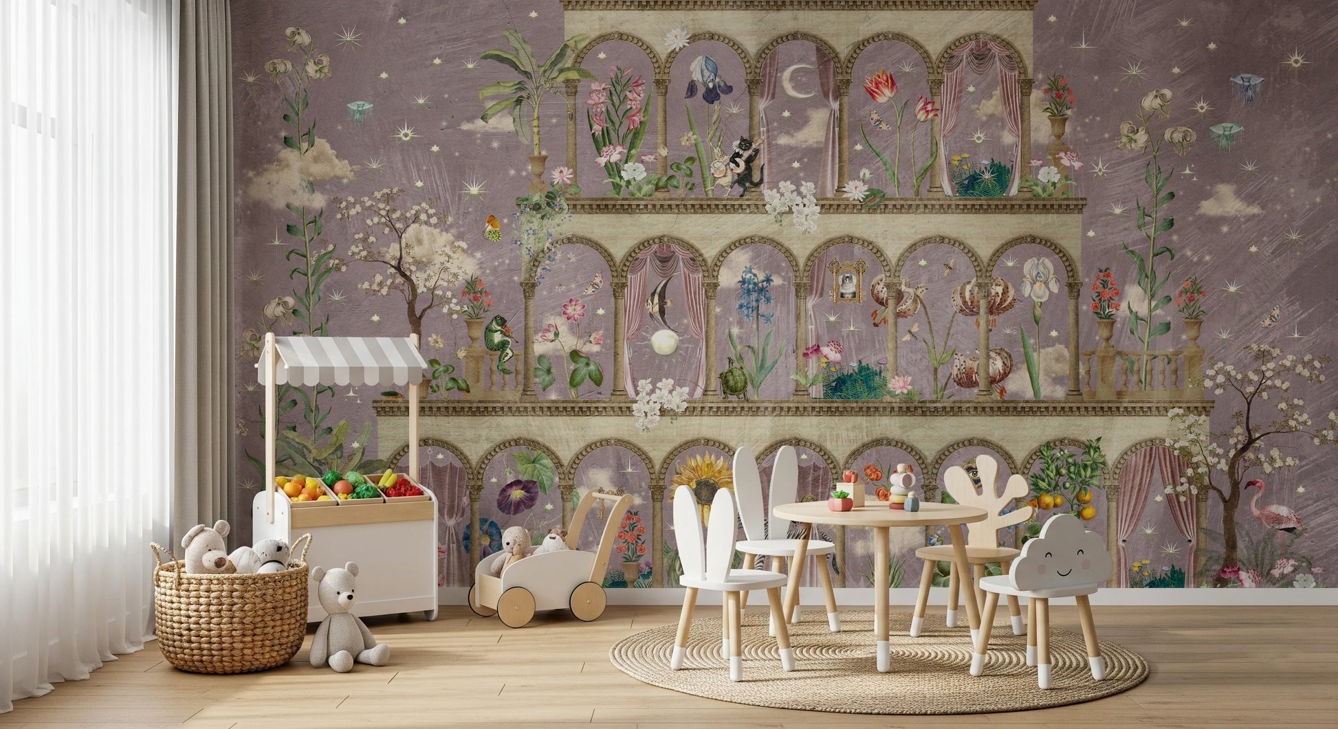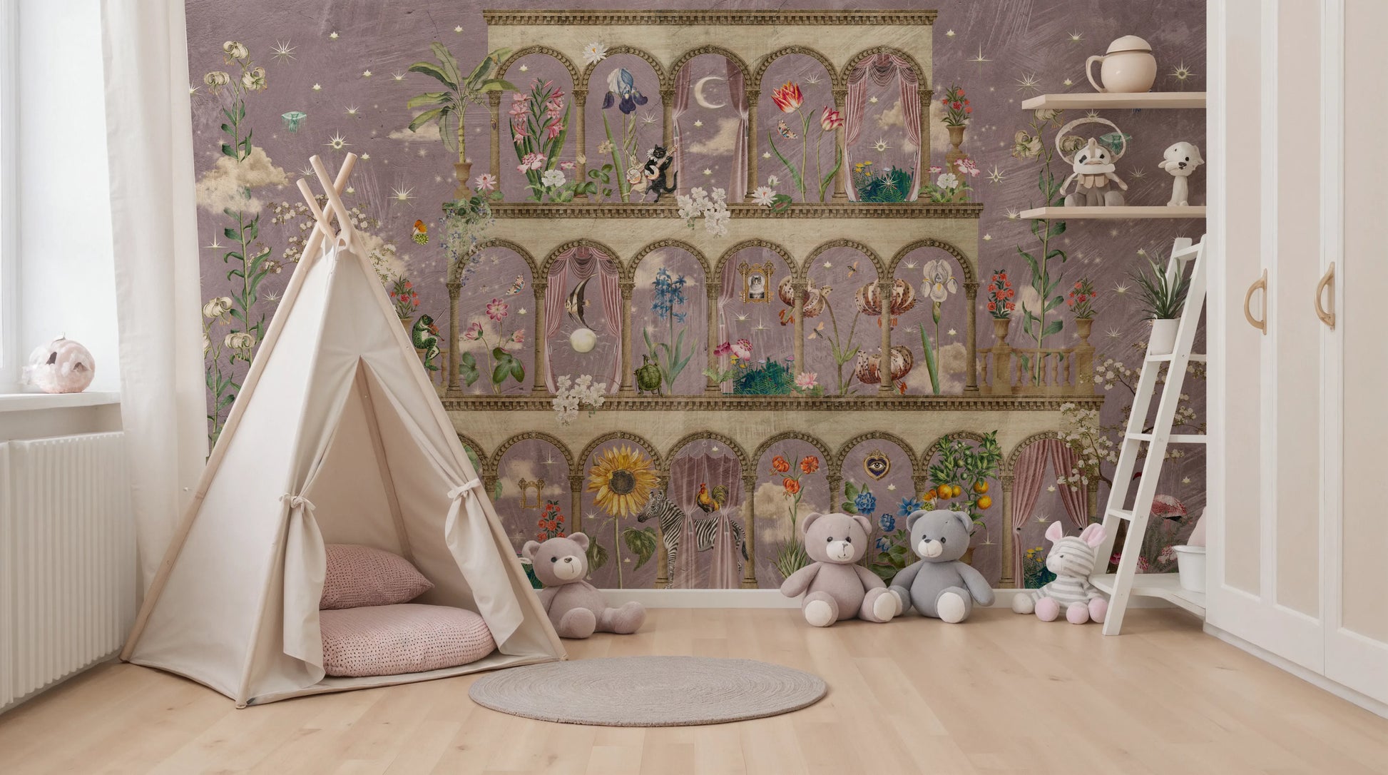 Transform your space into a whimsical dreamscape with "Floral Nightscape Garden on Pink". This enchanting design conjures the magic of a moonlit garden, showcased within a tiered architectural structure. Delicate blooms of every hue blossom against a soft pink canvas dusted with twinkling stars. Elegant archways frame surreal scenes: a feline musician serenading the moon, a whimsical zebra juxtaposed with a golden sunflower, and fantastical creatures amidst the foliage. Pale pink draped curtains add a touch of romance and grandeur to the scene. This wall décor brings a touch of the surreal to your walls and creates an environment that is both relaxing and inspiring. Invite the tranquil beauty of a nocturnal floral fantasy into your home.