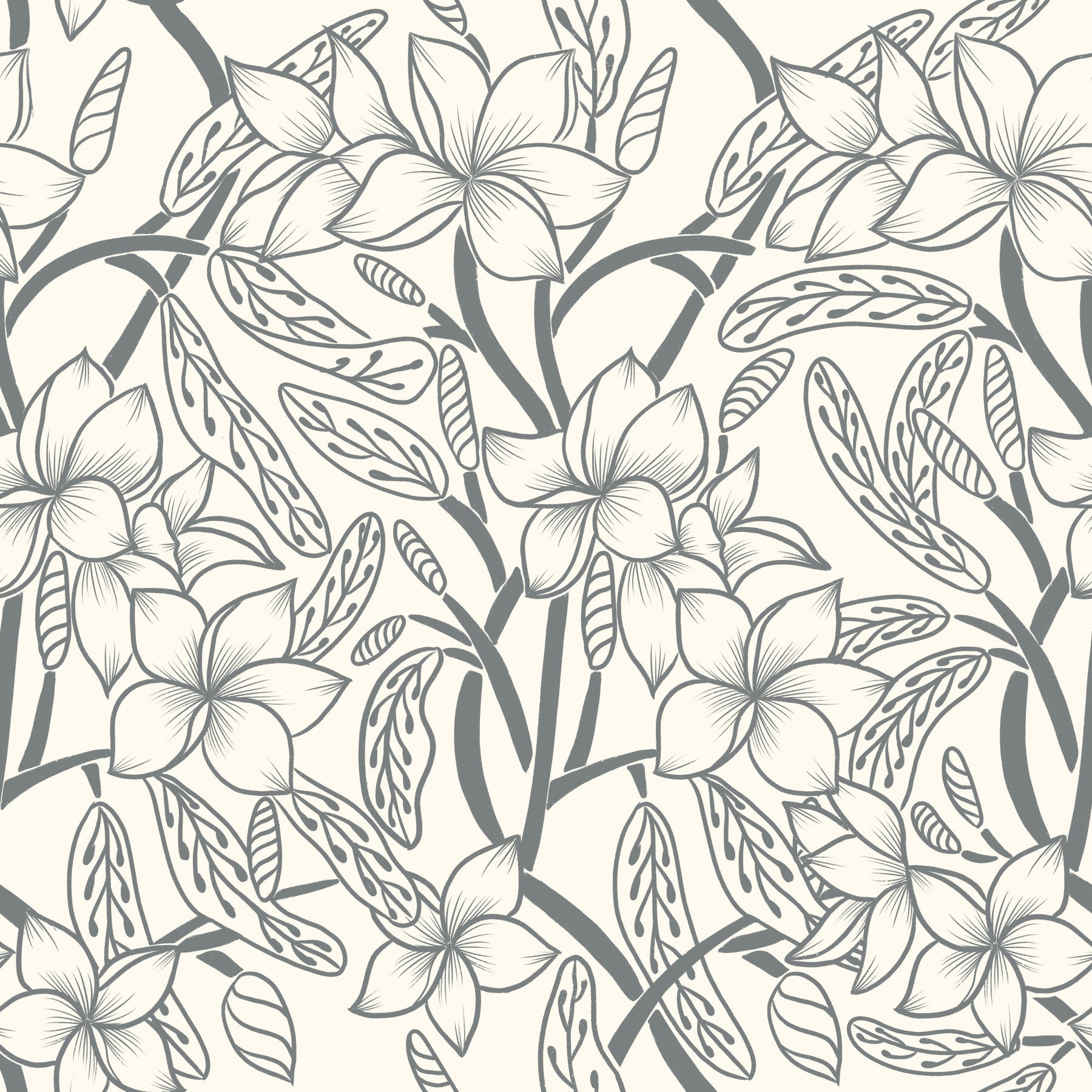 'Grey Garden Grace' brings a touch of understated elegance to any space. The wallpaper showcases a meticulously crafted pattern of plumeria flowers and leaves rendered in soft grey tones against a creamy backdrop. The detailed linework creates a sense of texture and depth, adding a sophisticated touch to bedrooms, living areas, or even hallways. This design exudes tranquility and sophistication, perfectly complementing both modern and classic interior styles.