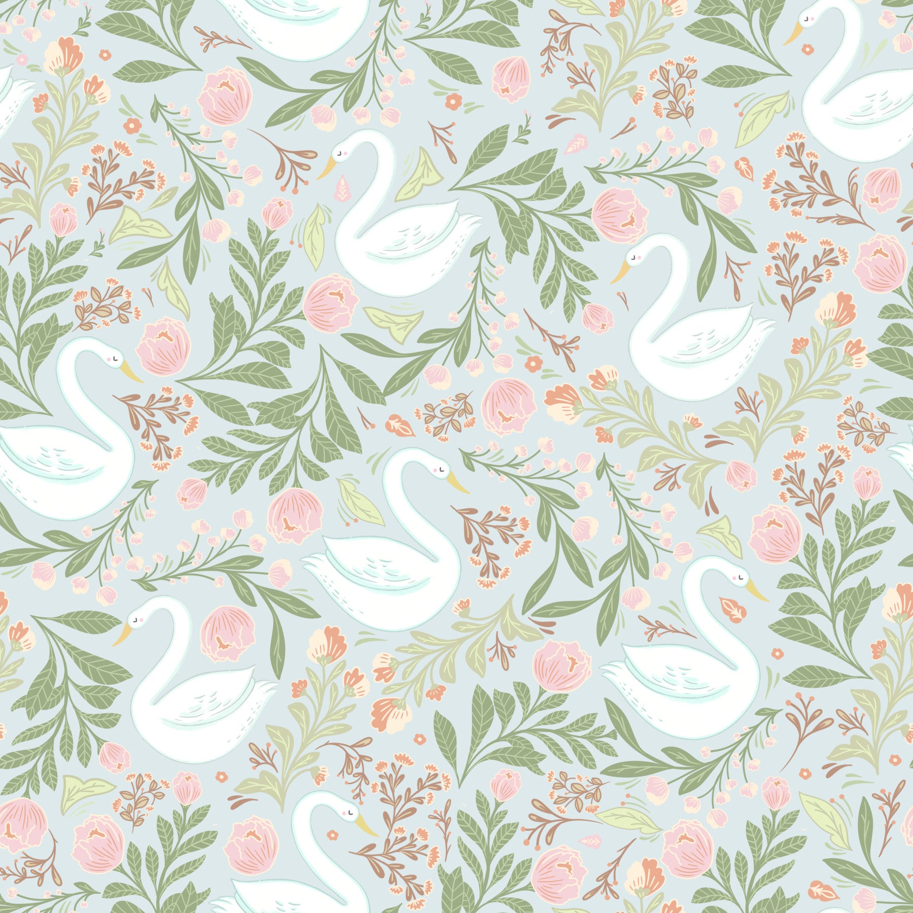 Transform your space with this charming wallpaper showcasing beautiful swans amidst a bloom of soft pink florals and lush green foliage. The gentle color palette and elegant design make it a perfect wallpaper for walls in a bedroom, nursery, or powder room. This wallpaper blends classic and modern aesthetics, creating a soothing atmosphere. Its intricate floral details pair beautifully with light-colored furniture and natural accents, enhancing the room's overall ambiance.