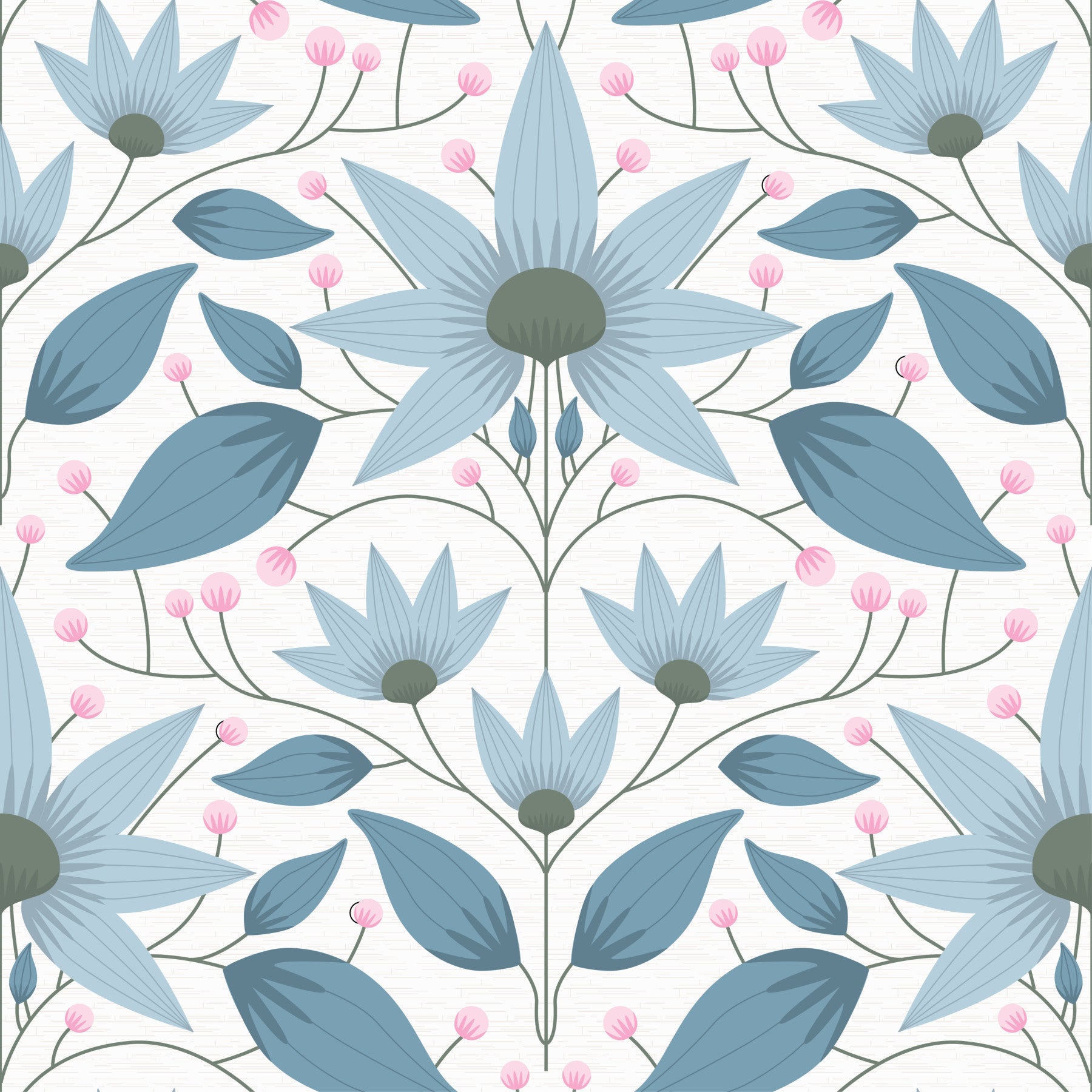 Immerse your space in the serene beauty of "Floral Symmetry Blue," a wallpaper design where delicate floral artistry meets balanced composition. This design features stylized blue blossoms arranged in perfect symmetry, creating a calming and harmonious visual rhythm. The interplay of soft blues and gentle pink accents against a subtly textured backdrop evokes a sense of tranquil elegance. Elongated leaves and tiny buds frame the main blooms, adding depth and complexity to the overall pattern. Ideal for creating a peaceful and inviting atmosphere, "Floral Symmetry Blue" transforms any room into a sanctuary of sophisticated charm. The symmetrical design provides a structured yet organic aesthetic, making it a timeless addition to your wall décor. Embrace the beauty of nature's geometry with this captivating floral arrangement.