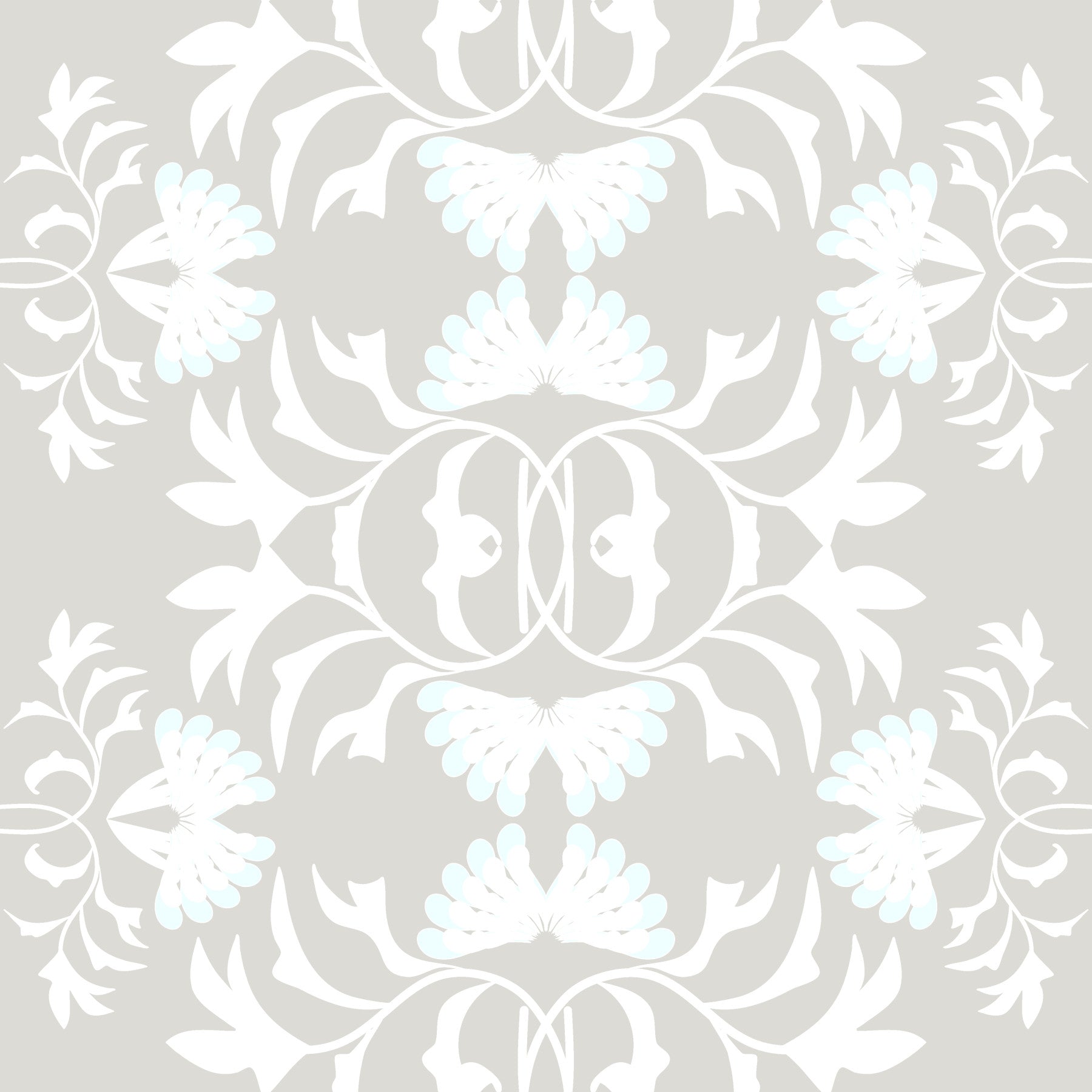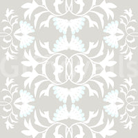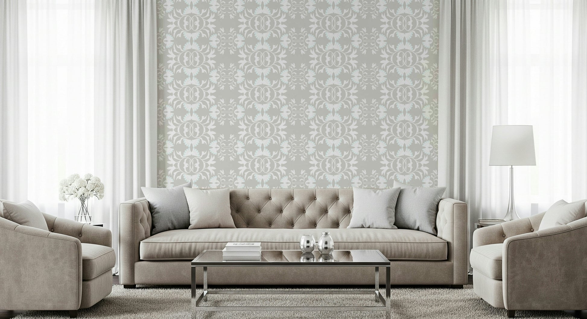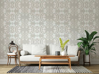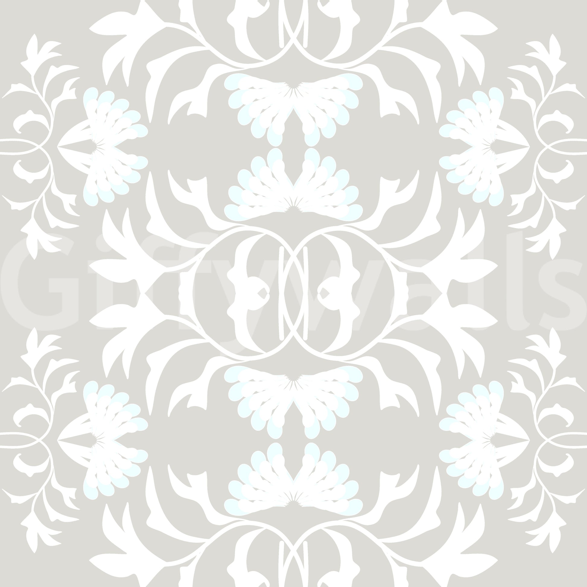 Embrace a timeless appeal with this refined wallpaper for walls, featuring symmetrical floral designs. The pattern, adorned with white botanicals and gentle hints of pale blue, stands out against a soft beige backdrop. This elegant wallpaper design elevates the ambiance in bedrooms, living rooms, or dining areas. The neutral palette seamlessly works with various interior styles, from traditional to modern. Its soothing color scheme creates a calm and sophisticated look in any space. You can easily create an elegant space in your home.