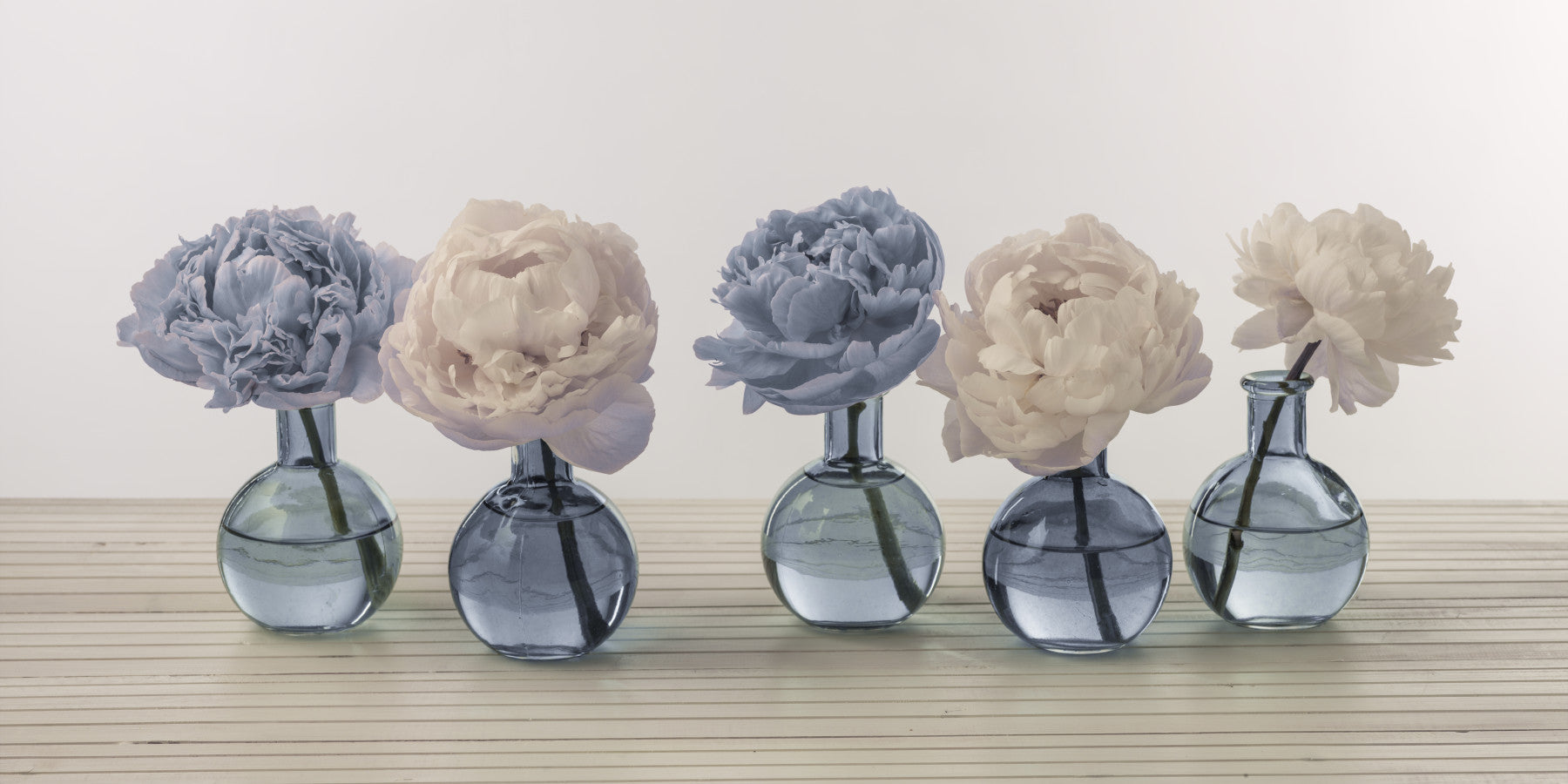 Peonies in glass bottles. Infuse your space with the subtle grace of this peony themed wallpaper for walls. The design features delicate peonies in clear glass vases. The soft blues and creamy tones create a refreshing and sophisticated visual effect. This design effortlessly elevates bedrooms, living rooms, dining areas, and even home offices. It blends well with modern and classic interiors, adding a layer of simple sophistication. Transform your walls with the serene charm of nature. The gentle color palette and understated floral imagery ensure a seamless addition to any interior aesthetic, adding a touch of tranquility.