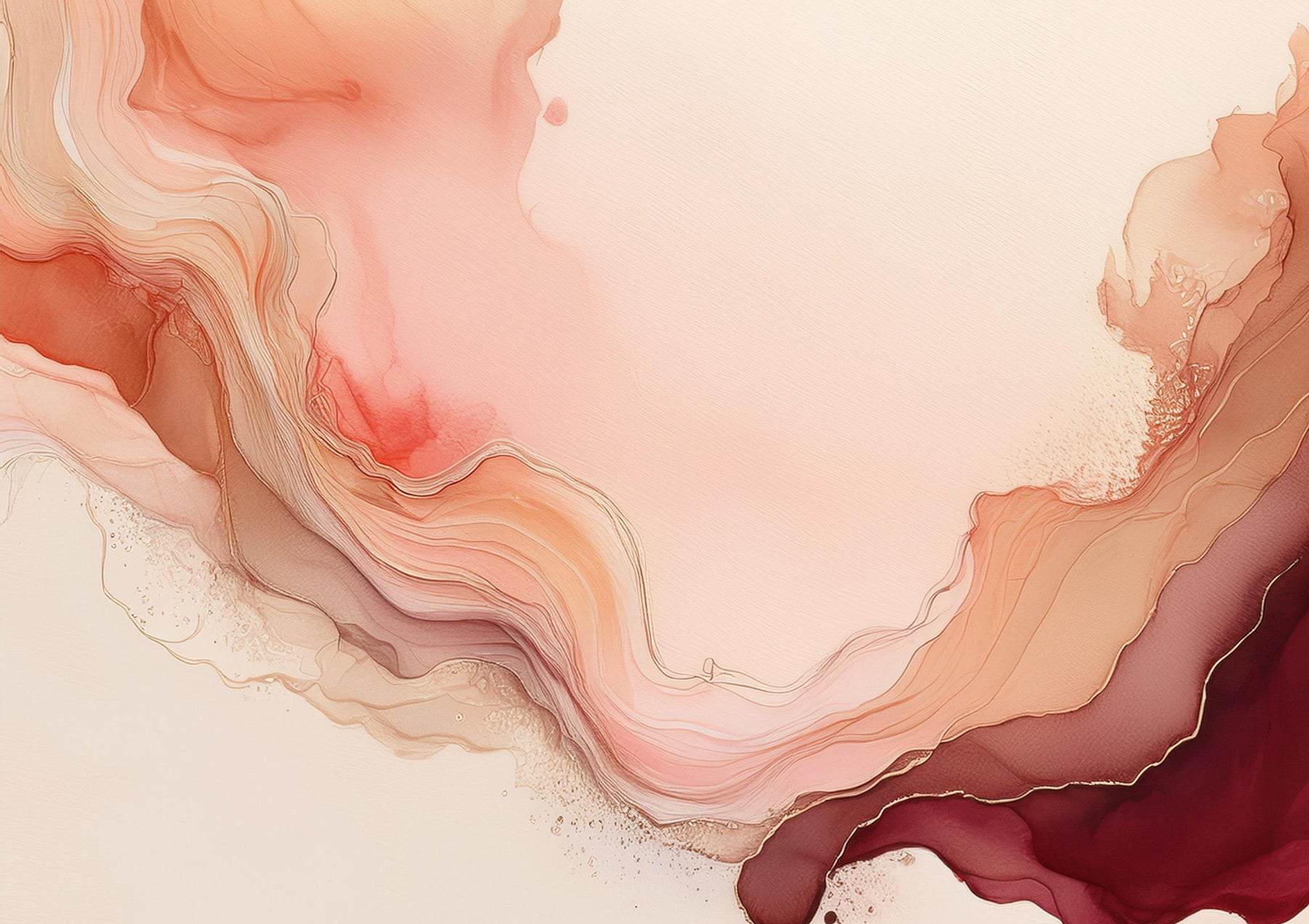 This abstract wallpaper evokes the serene beauty of a desert landscape at dawn. Soft, flowing hues of blush pink, terracotta, and deep burgundy create a mesmerizing visual narrative. Delicate gold accents mimic the first rays of sunlight, adding a touch of luxury and elegance. The organic shapes and color transitions create a calming, almost meditative atmosphere, perfect for bringing a sense of tranquility to any space. The piece balances warmth and sophistication, making it an ideal choice for those seeking a sophisticated yet understated aesthetic.