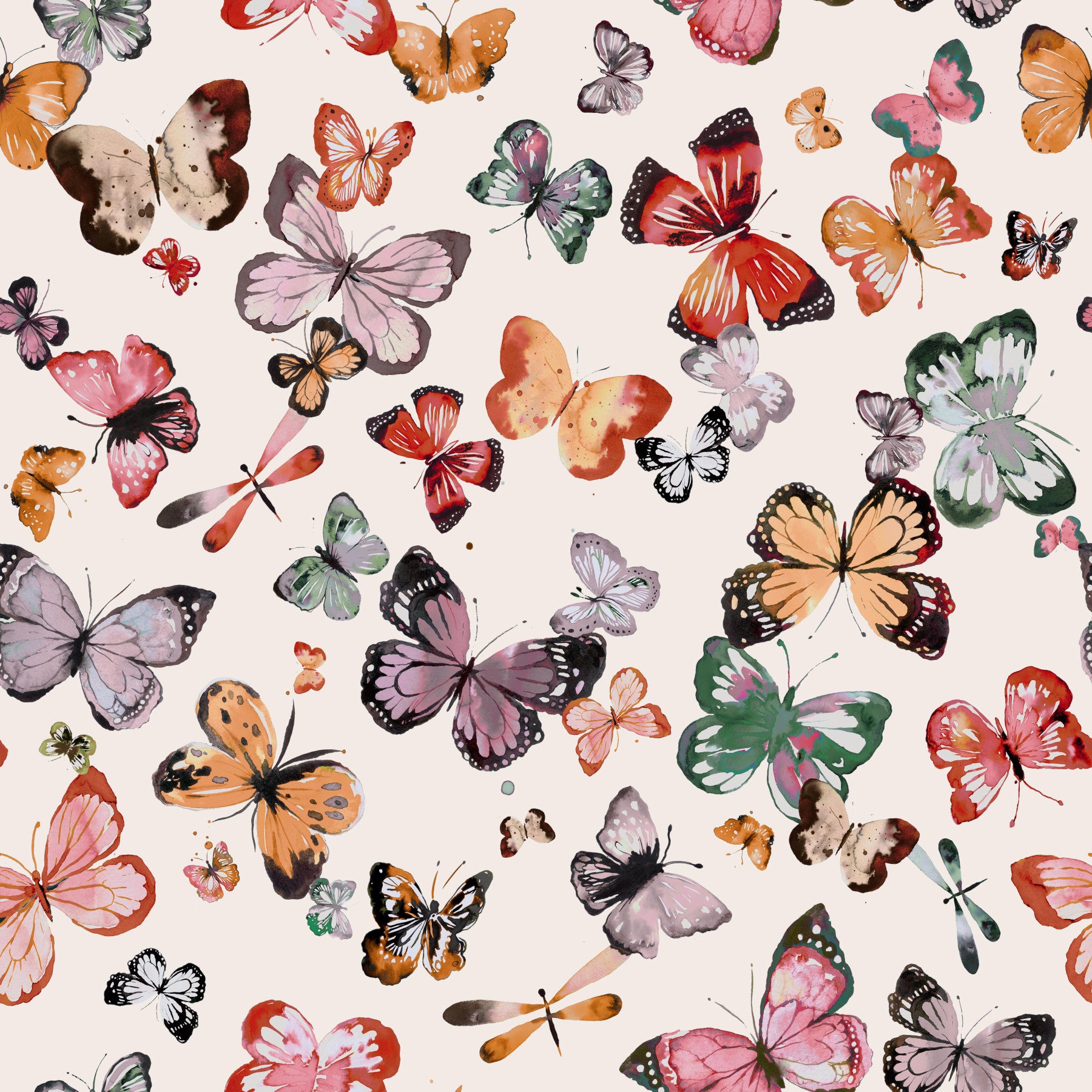 Embrace the vibrant beauty of a sun-drenched countryside with this captivating wallpaper. A profusion of watercolor butterflies in a kaleidoscope of colors—from rich reds and oranges to soft pinks and greens—dance across a creamy backdrop. Delicate details and subtle watercolors bring each butterfly to life, creating a whimsical and serene atmosphere. Dragonflies flit amongst the butterflies, adding to the lively, natural scene. This wallpaper evokes a sense of peaceful tranquility and the joyous freedom of nature's gentle dance, perfect for adding a touch of whimsical charm to any digital device.