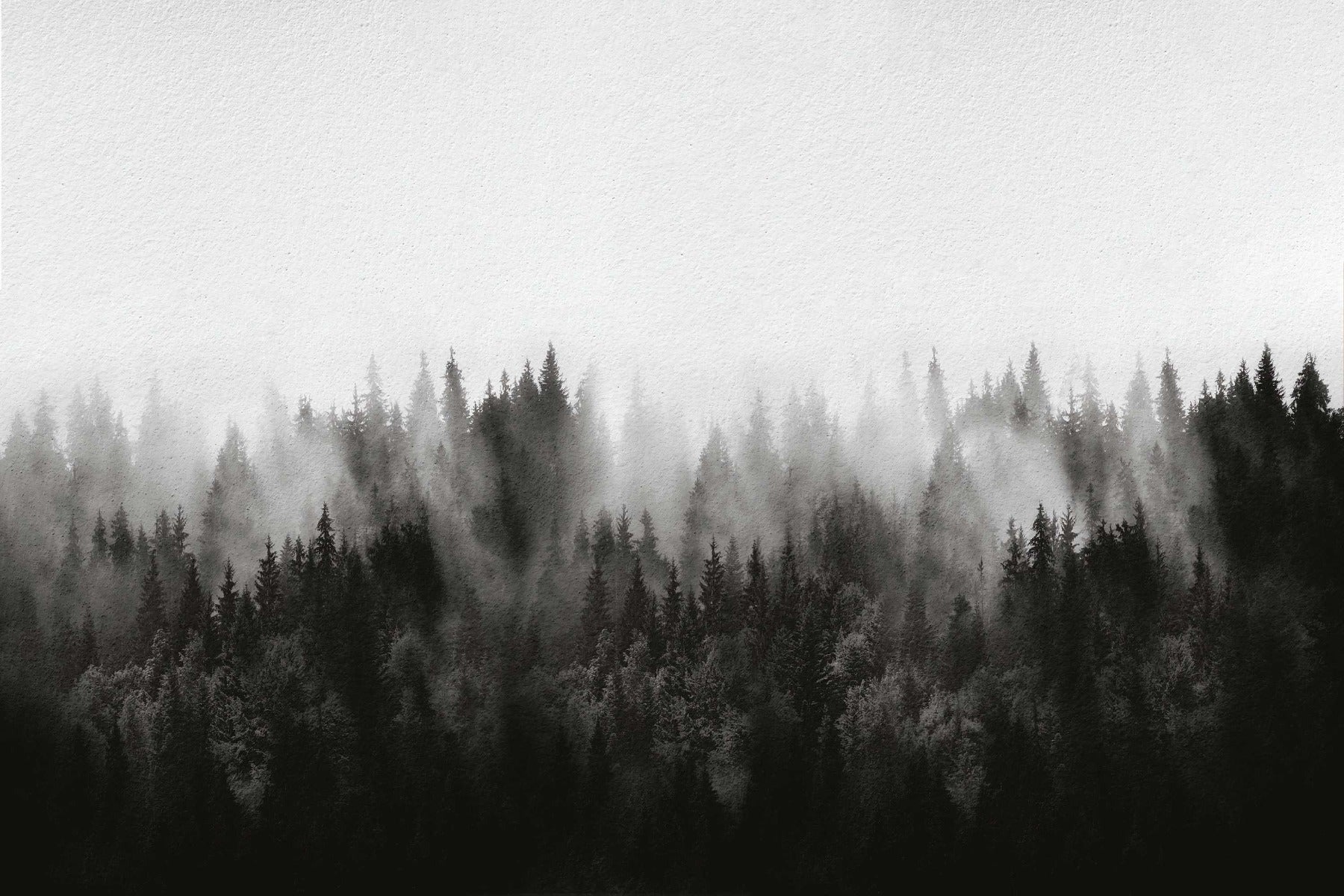 Elegant foggy forest mural with soft pine tree silhouettes.