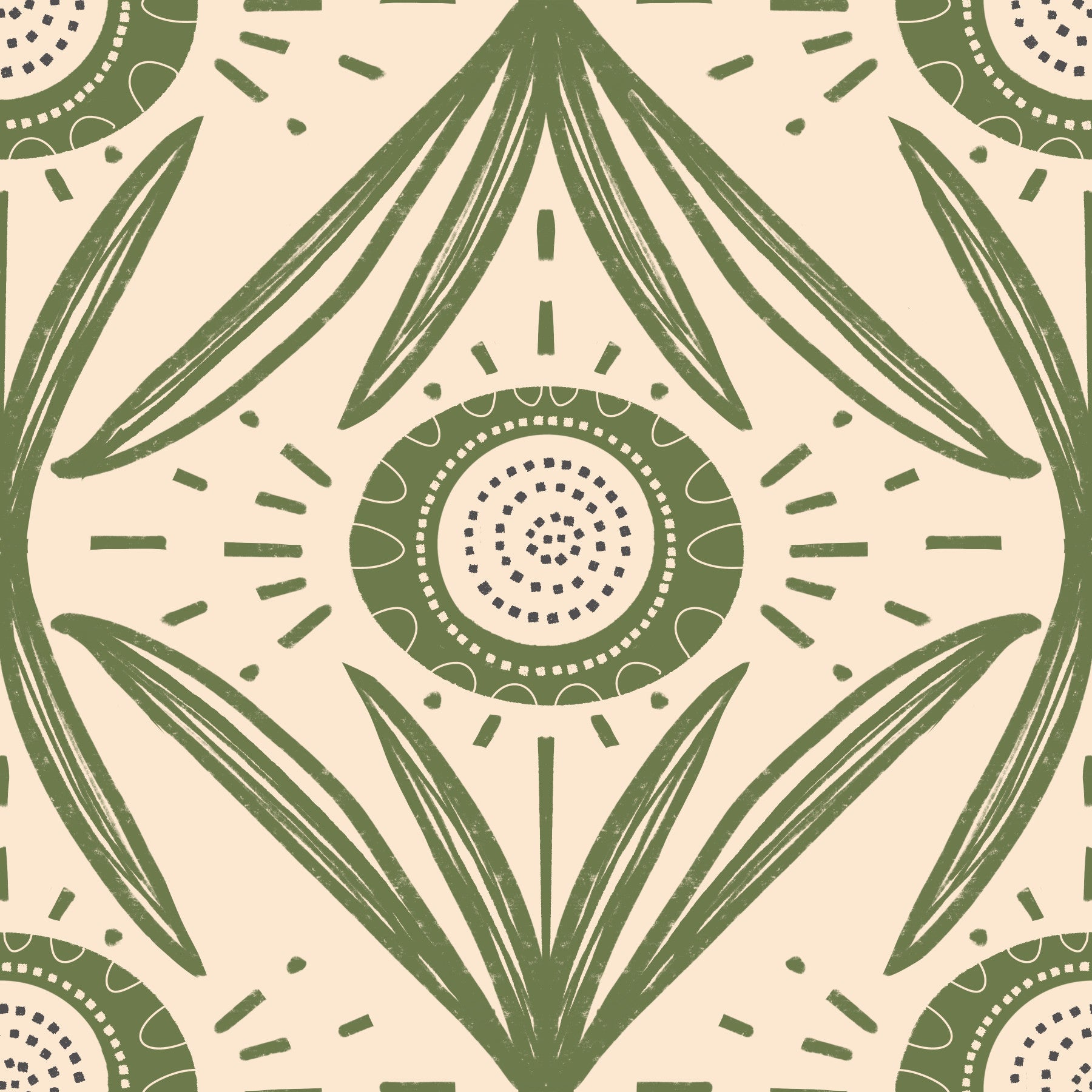 Embrace the rustic charm with Folk Bloom Radiance Olive Green a farmhouse floral wallpaper that exudes a sense of serene beauty. The hand-drawn style olive green botanical motifs, arranged in a symmetrical pattern, radiate a subtle radiance against the muted background. Circular focal points, reminiscent of blooming flowers, add a touch of folk art elegance. This wallpaper evokes a comforting, homespun feeling, perfect for creating a warm and inviting space. Its subdued color palette allows for seamless integration into various decor styles, bringing a touch of nature-inspired artistry to any room. The design provides an effortless blend of modern simplicity with traditional pastoral charm.